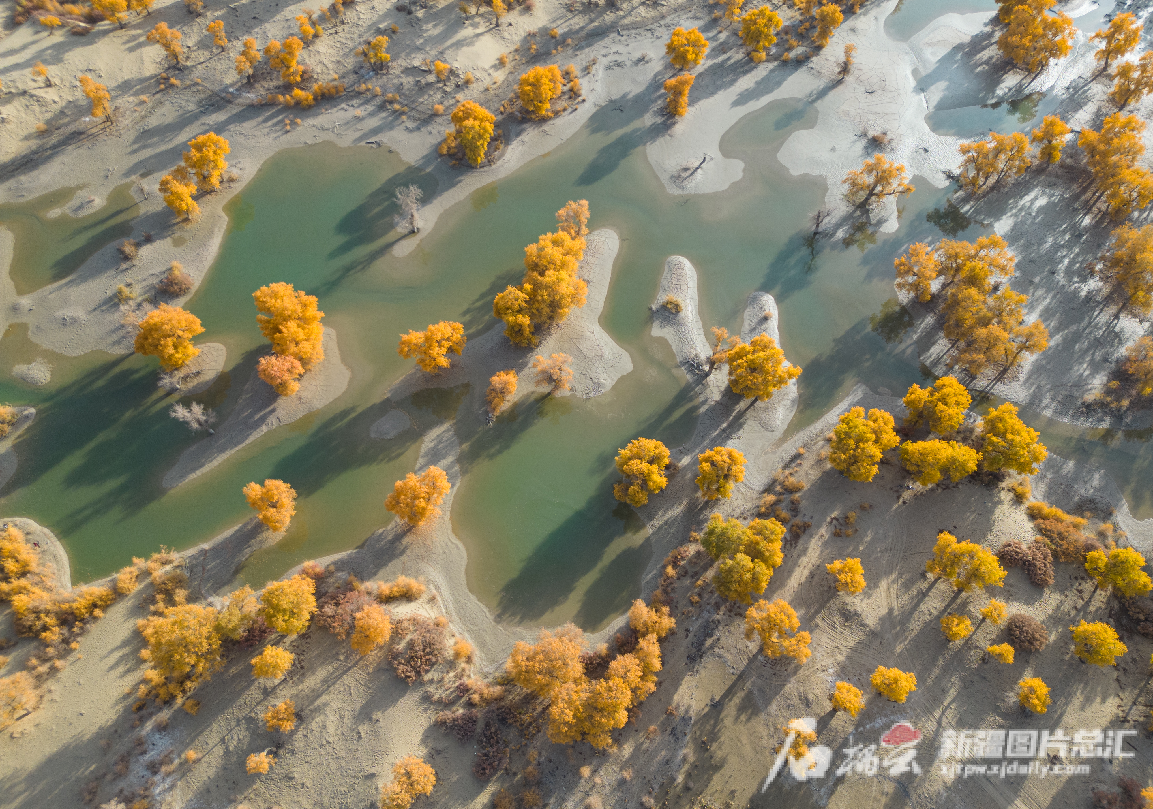 俯瞰新和县渭干河畔的胡杨林景色(11月1日无人机摄)。眼下,渭干河畔连片的胡杨林满目金黄,阳光洒落其中,美不胜收,吸引众多摄影爱好者和游客前来拍摄游玩。魏浩东摄