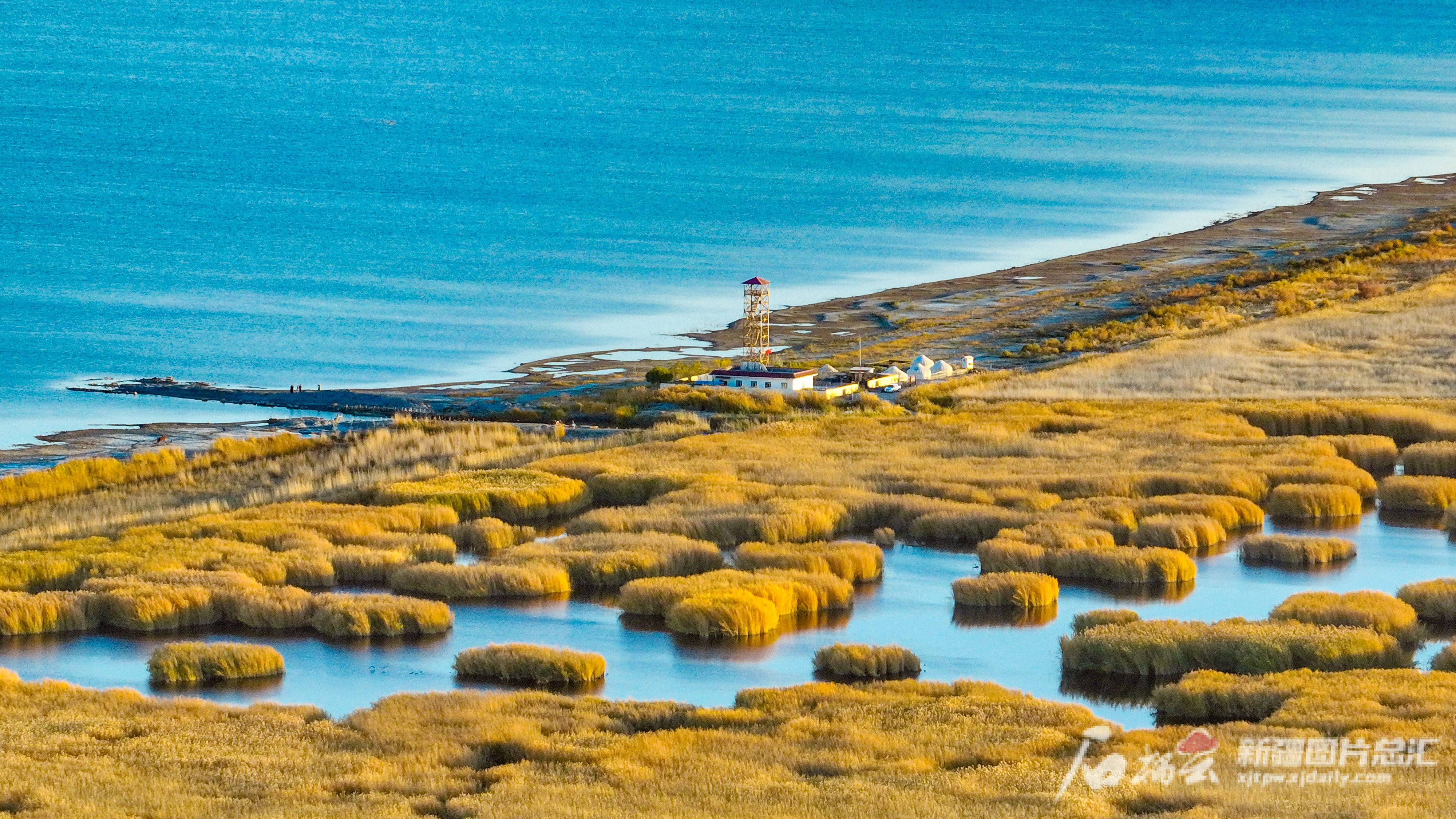 俯瞰博斯腾湖湿地(11月1日无人机摄)。深秋时节,位于博湖县境内的博斯腾湖湿地呈现出秋日湿地满目金黄的美丽景象,吸引游客前来观光旅游。年磊摄