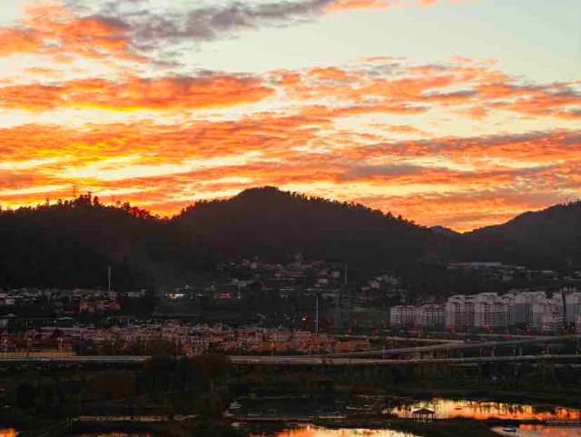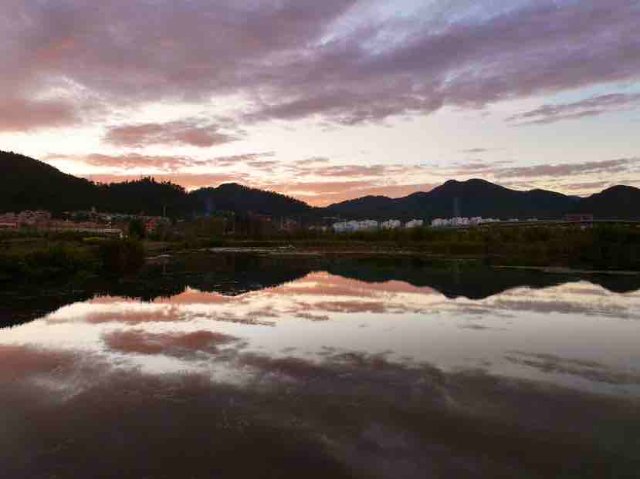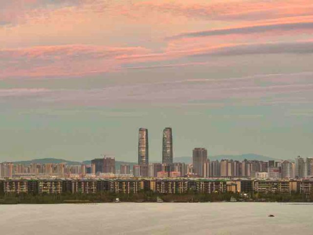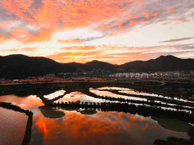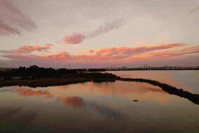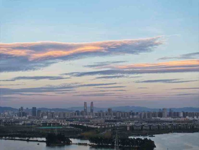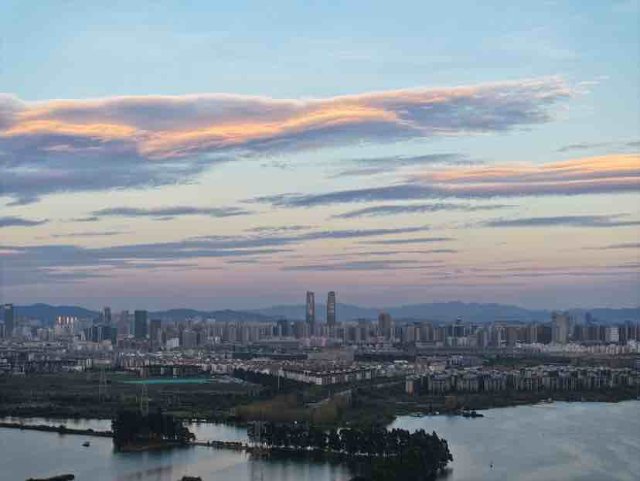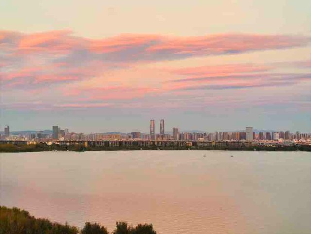 被日落余晖一染,这些鱼鳞云便成了“火烧云”。天空中呈现绝美景色的同时,整个滇池水也被“染”成了绝美的橙粉色。以无人机视角远眺,万达双塔也清晰可见,远处建筑和植物的倒影呈现在滇池中,水天一色,宛如仙境。