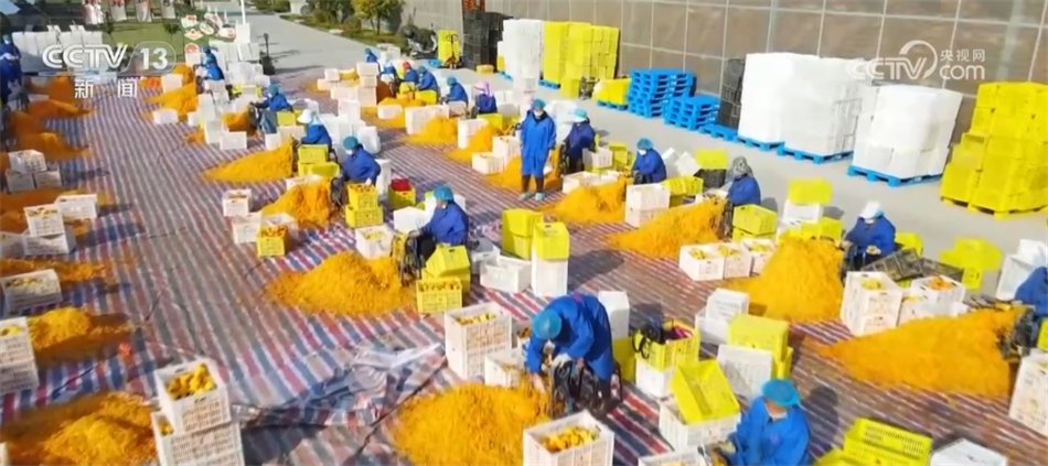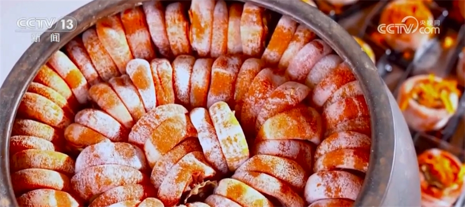 总台记者谭海梅:从削皮到吊挂到晾晒,这中间还得在经过三次的“捏心”,让这里面的糖分能够很好地释放,从霜降一直到冬至,富平柿子才会成为口齿留香的柿饼。