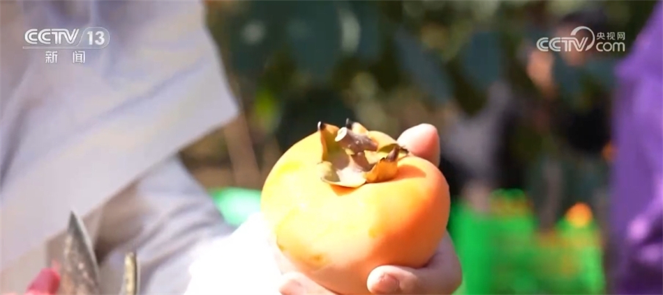 总台记者谭海梅:像水滴一样的富平尖柿,它的果实是比较硬的,因为富平柿子主要是用来做柿饼,所以从树上到我手上,这只是在采摘园里的第一步,还要进行第二次的修剪,剪成“丁”字把儿。