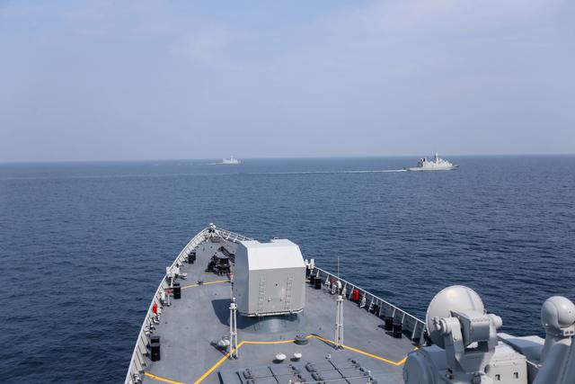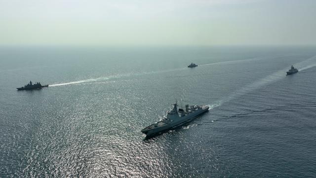 11月3日,中国海军第44批护航编队在阿布扎比扎耶德港附近海域与阿联酋海军进行海上联合演练,双方舰艇组成双纵队航行。新华社发(叶宇骏摄)