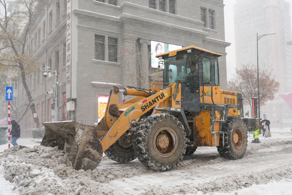 11月6日,一辆铲车在哈尔滨中央大街上铲除积雪。新华社记者 王大禹 摄