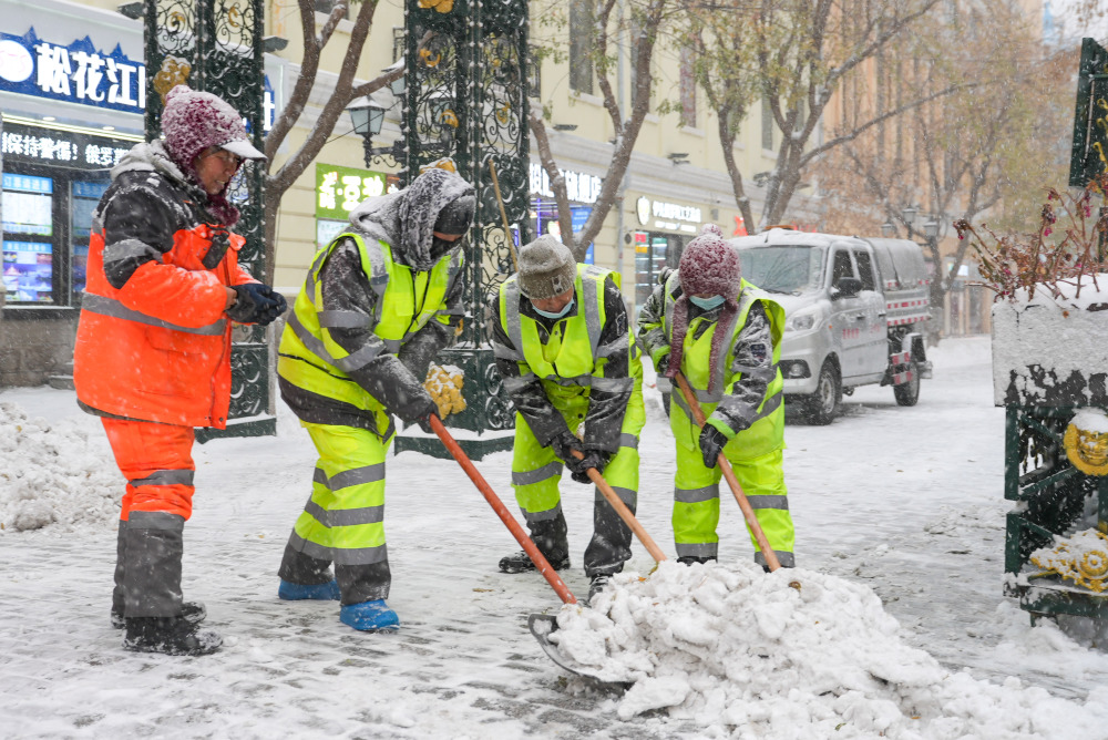 11月6日,工人在哈尔滨中央大街上铲除积雪。新华社记者 王大禹 摄