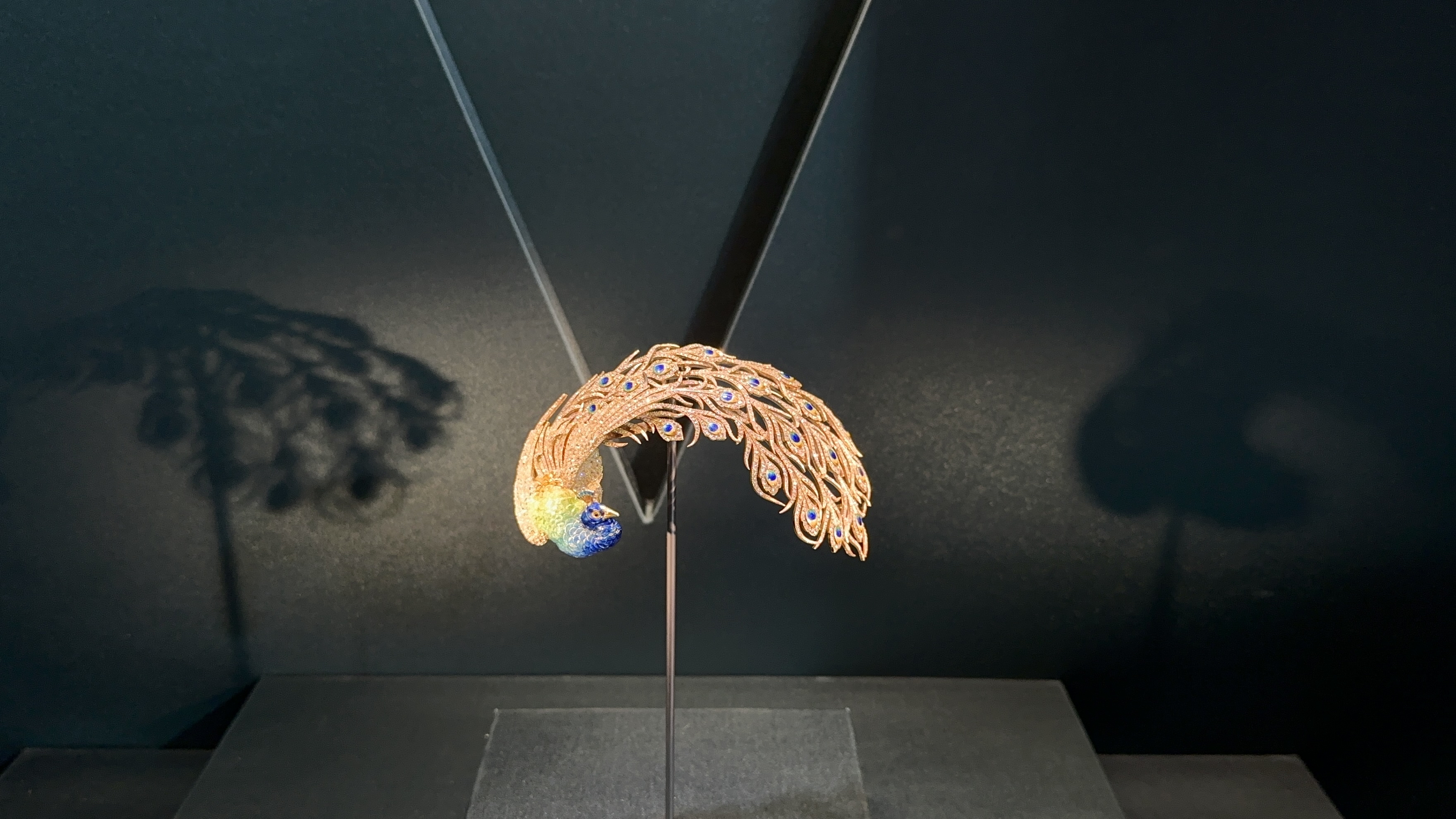 冠冕之外,品牌珍藏的众多明星展品也悉数出现在展厅。其中,身价过亿的孔雀羽饰闪亮夺目,它是珠宝艺术史中最为著名的设计之一,曾经在英国维多利亚与阿尔伯特博物馆、故宫博物院、美国大都会博物馆作为明星展品展出。