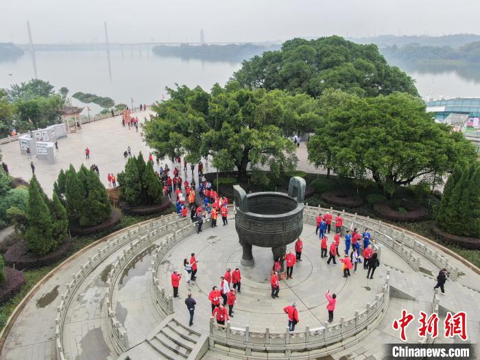 图为第32届世客会客属宗亲代表来到赣江之畔的客家先民南迁纪念坛参观,该坛为赣州举办第19届世客会时所建。刘力鑫摄