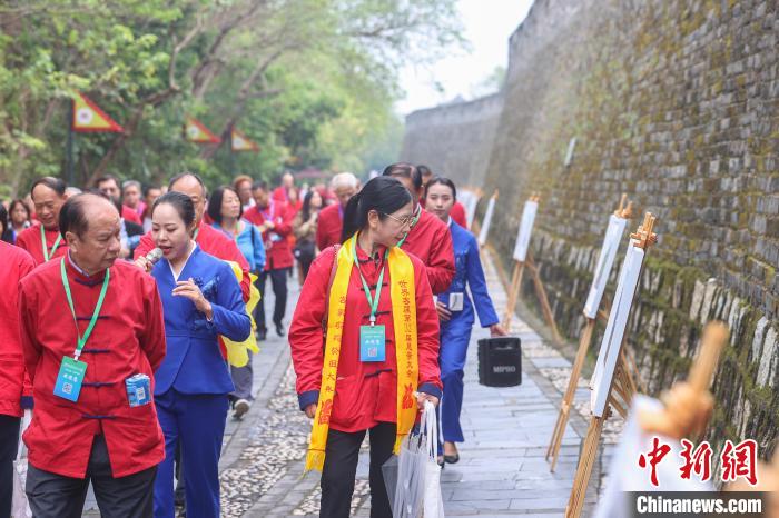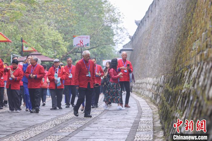 图为第32届世客会客属宗亲代表漫步在石板路上参观赣州宋代古城墙。刘力鑫摄