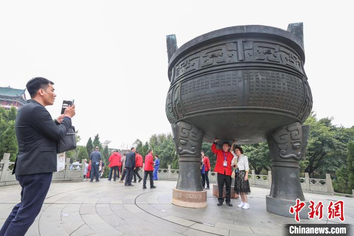 图为第32届世客会客属宗亲代表在客家先民南迁纪念坛旁拍照,该坛为赣州举办第19届世客会时所建。刘力鑫摄