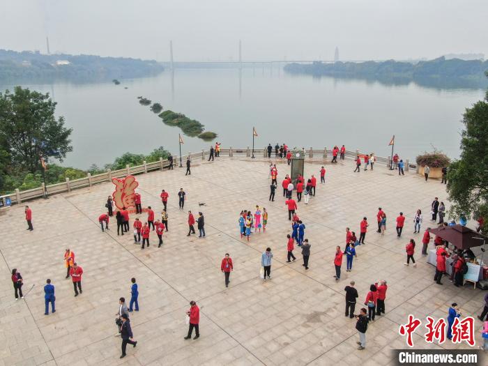 图为第32届世客会客属宗亲代表来到赣州城北、赣江之畔的龟角尾公园参观,相传客家先民南迁溯赣江而上抵达赣州城时,就是在龟角尾登岸。刘力鑫摄