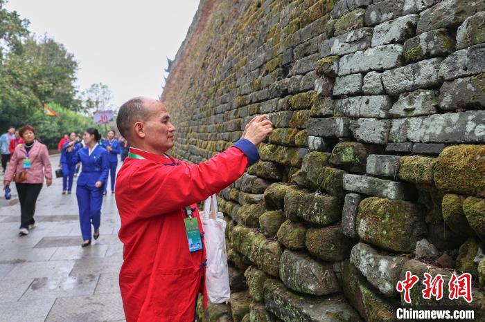 图为赣州宋代古城墙的城墙砖吸引第32届世客会客属宗亲代表拍照。刘力鑫摄