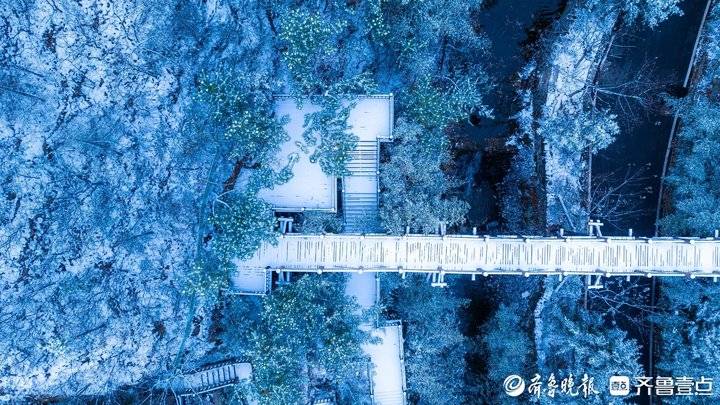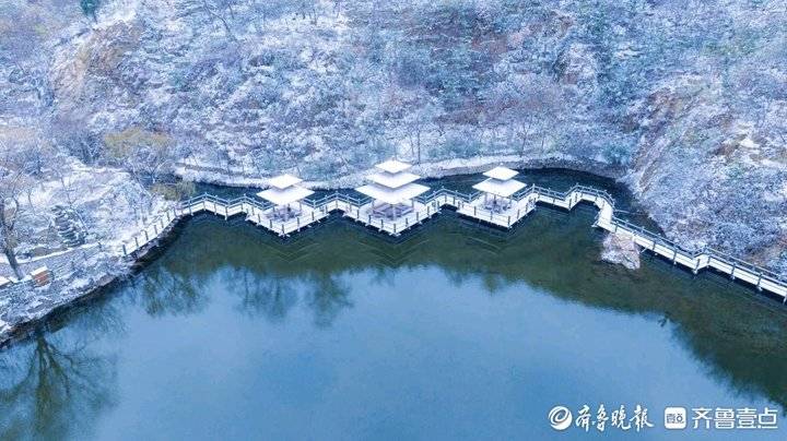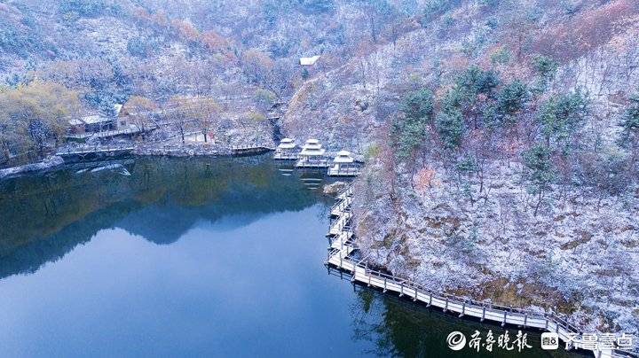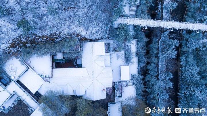 2023年11月11日清晨,济南九如山飞舞了一夜的雪,让万顷山林披上银装。山涧、屋脊、栈道上都铺满了一层晶莹剔透的白雪,彩林、云雾绿水相融。