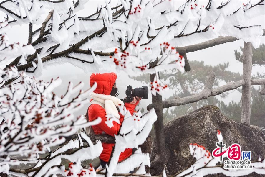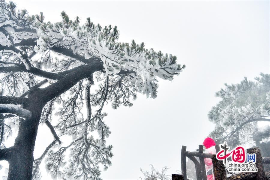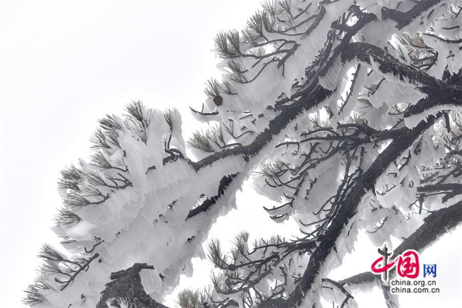 雾凇是黄山冬季最具神奇的景观,一般集中在11月下旬到次年的3月上旬。当气温在零摄氏度以下,遇上雾气湿度大,水汽附着在树木等物体上,便会被冻结,形成雾凇景观,雾凇的形成多少和雾气的浓度、持续的时间以及的温度有关系。(姚育青)
