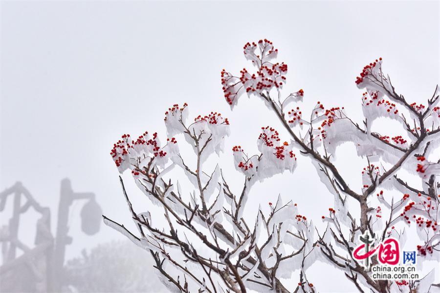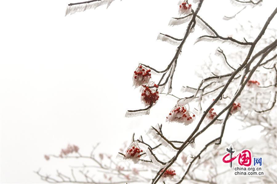 一瞬间,千树万树梨花开,玉树琼枝美如画。从古树苍松到灌木杂草,枝头无不缀满了晶莹的冰霜,在寒风中裹上了素衣白袍,还有秋的果实被雾凇包裹其中特别显眼。