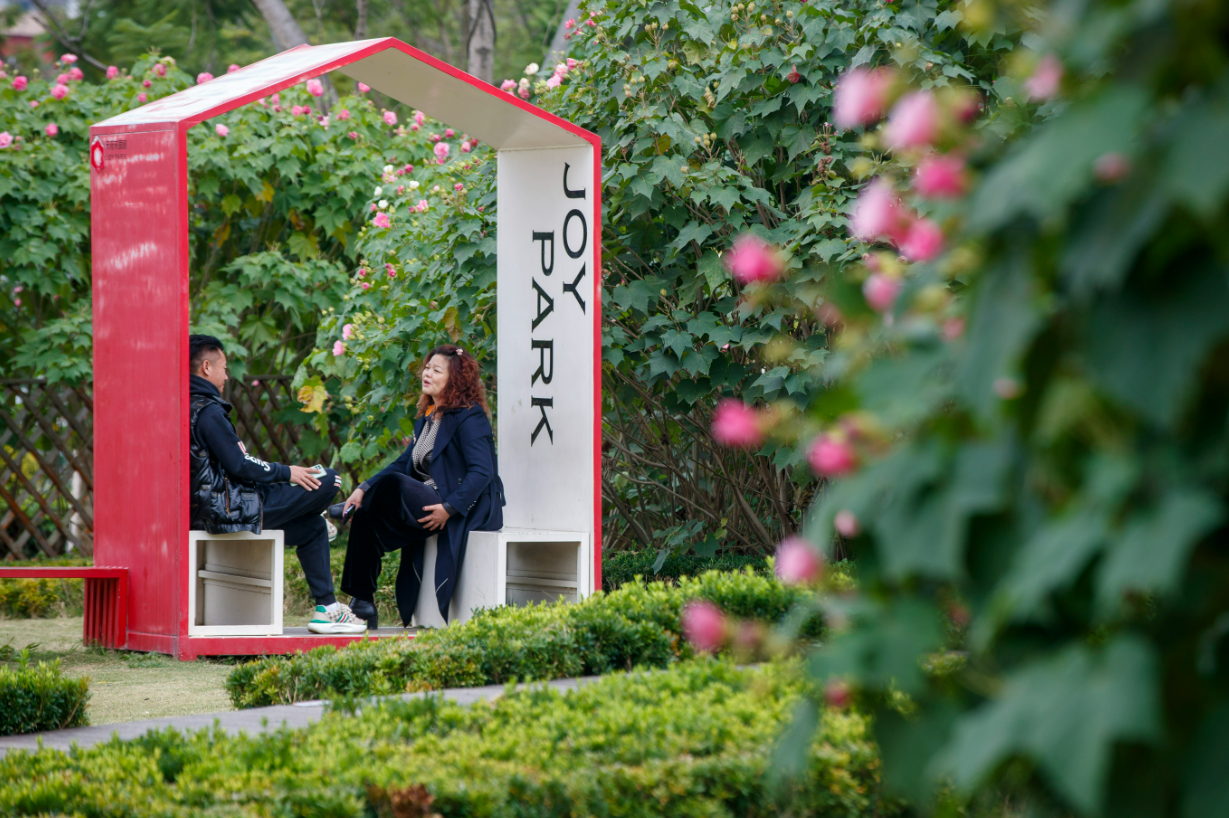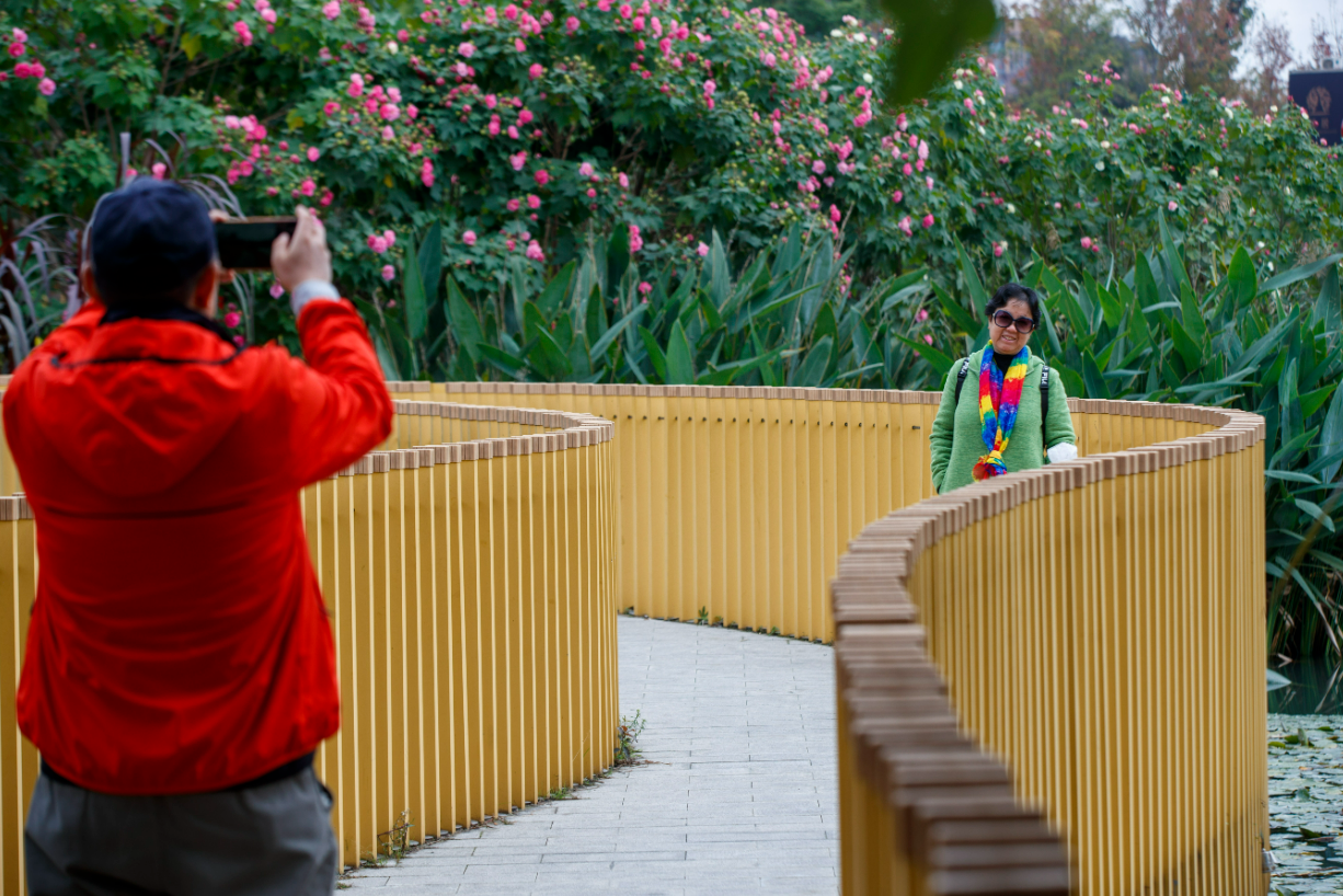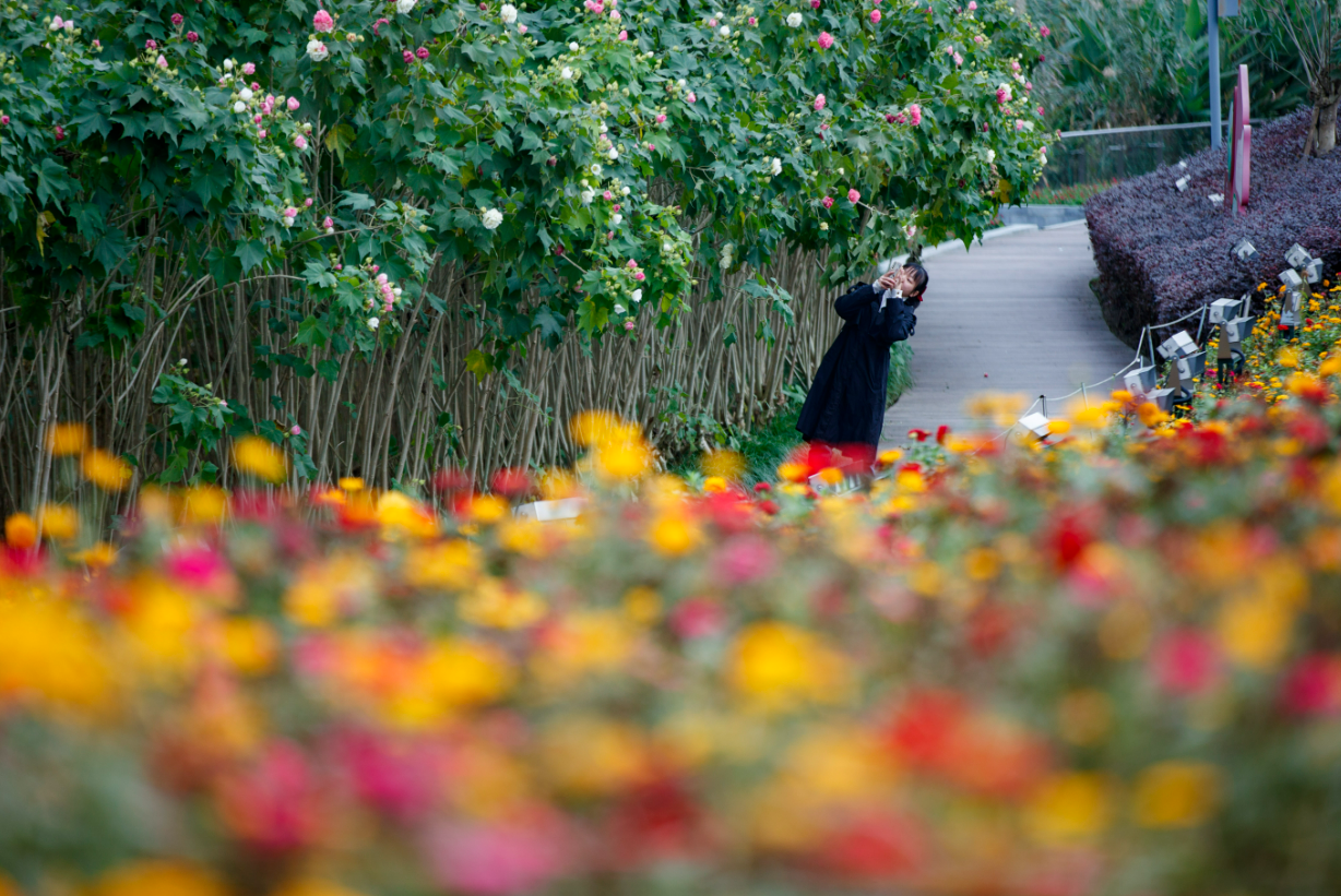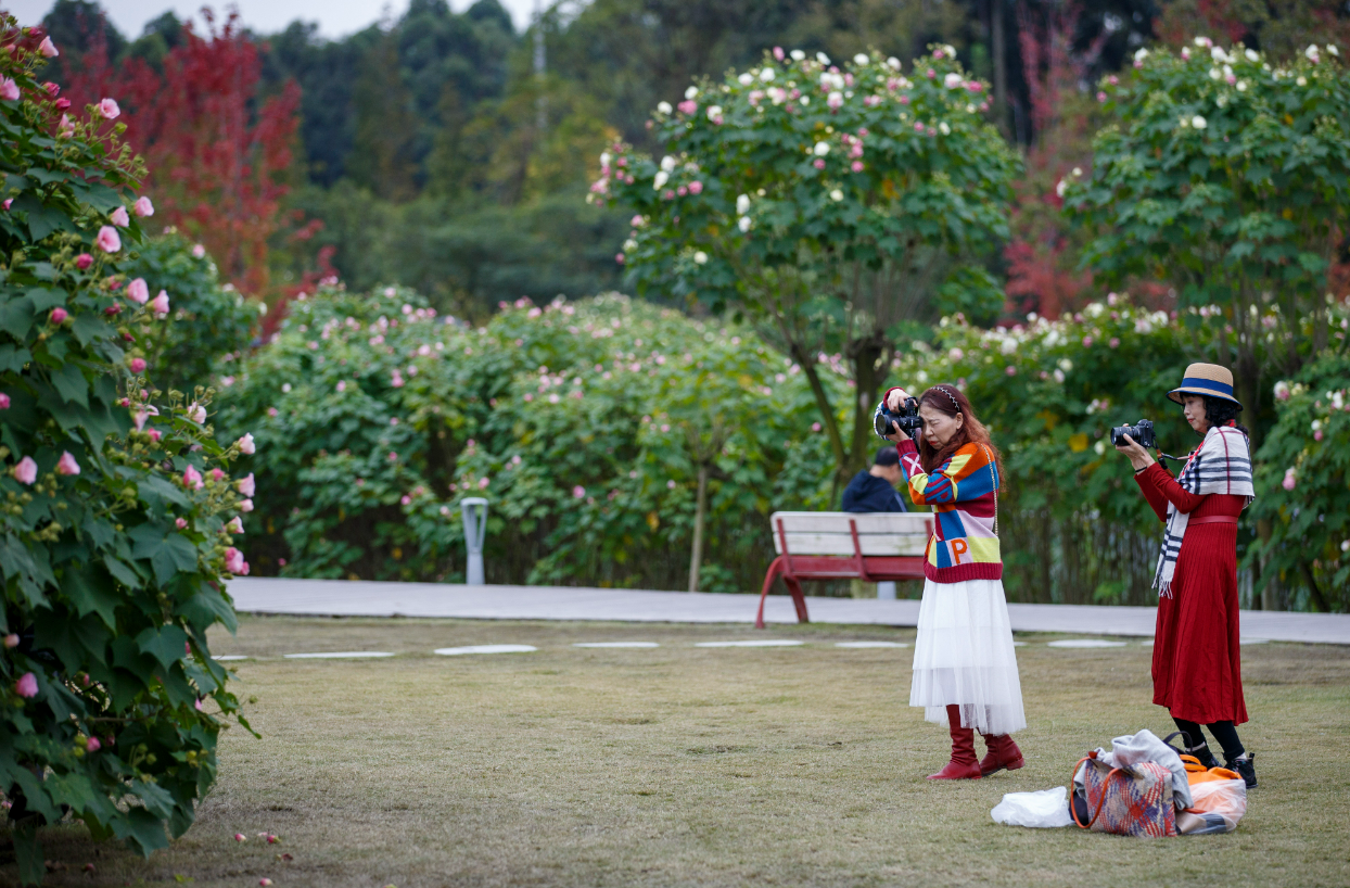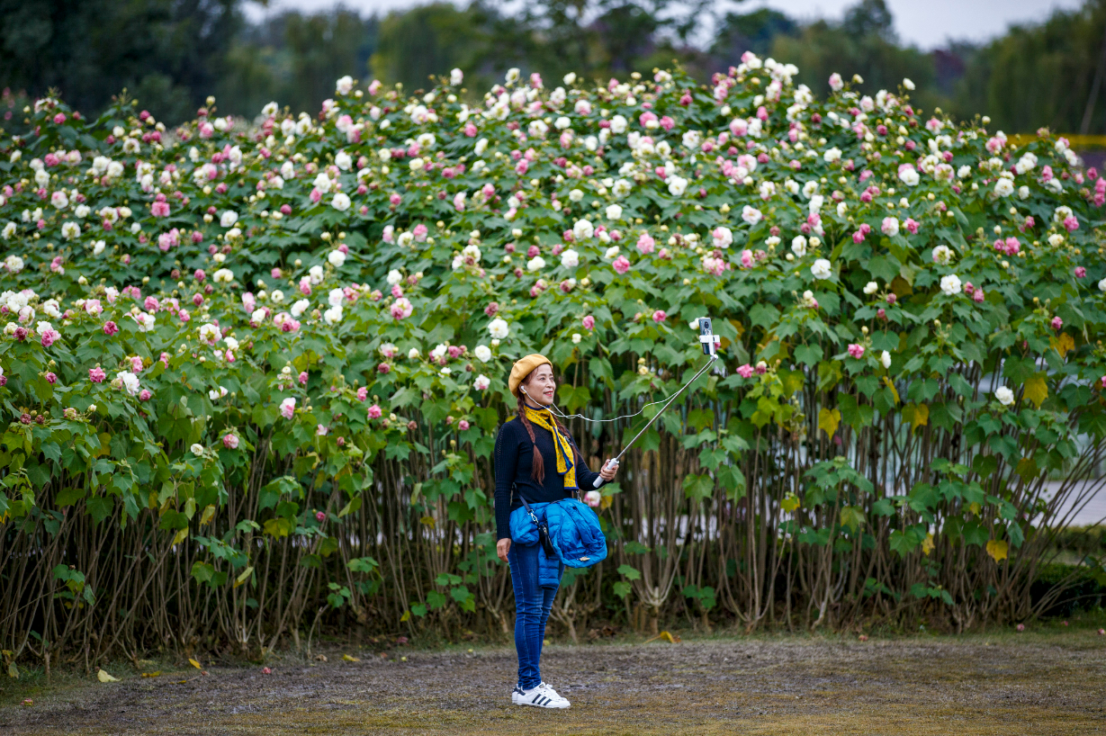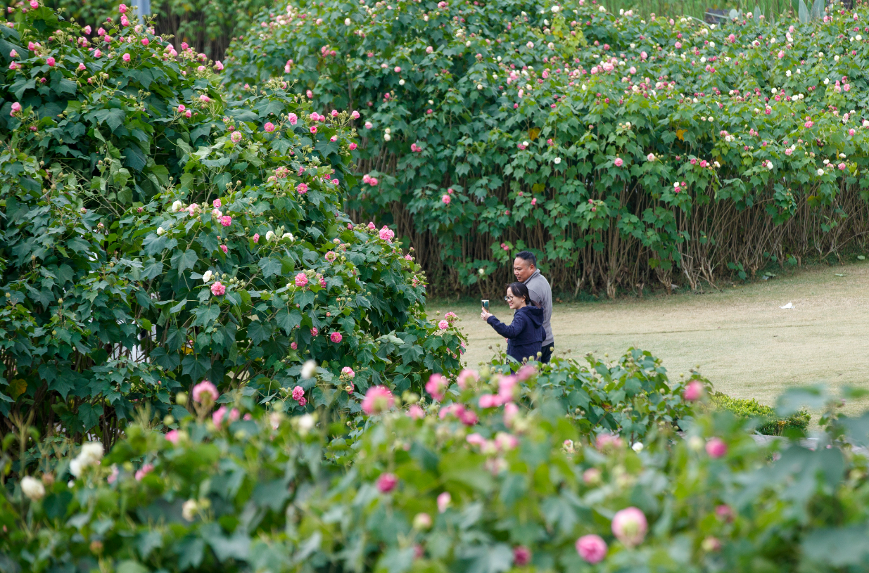11月13日,暂别前几日的阴雨,空气格外清新。在以芙蓉为名的成都天府芙蓉园,30000余株芙蓉正值盛花期,仔细观瞧,缤纷繁华之下,各处各种芙蓉花,有着不同的姿态与美感。它们有的高悬枝头,迎风摇曳,有的花枝低矮,正适合当作最佳背景墙,引得市民游客不停地拍照留念。