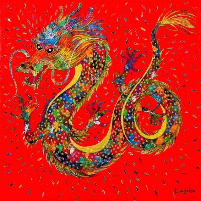 这幅作品中的龙一改西方凶神恶煞的形象,龙须、龙角、龙爪间处处透着中国龙的特征。通过延续自己一贯的鲜艳浓烈的艺术风格,让-弗朗索瓦·拉赫优创作出一幅底色为红色,龙身由黄、绿、蓝、紫、黑、白、褐等多种颜色组合而成的《龙》油画作品。