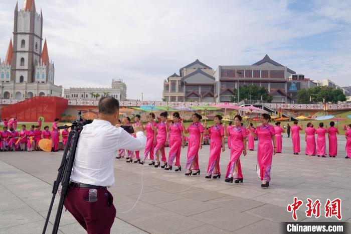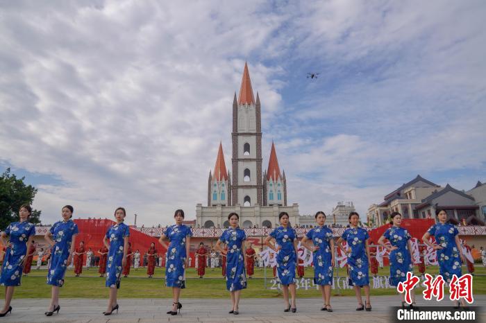 旗袍模特在亭子码头走秀。王以照 摄