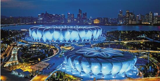 11月20日是世界儿童日。为推进杭州儿童友好城市建设,让更多人听到儿童的声音、关心儿童的权利,杭州用象征儿童友好的蓝色灯光点亮城市标志性建筑,通过灯光秀等开展户外公益宣传。图为20日晚,杭州奥体中心大小“莲花”点亮蓝色之光。