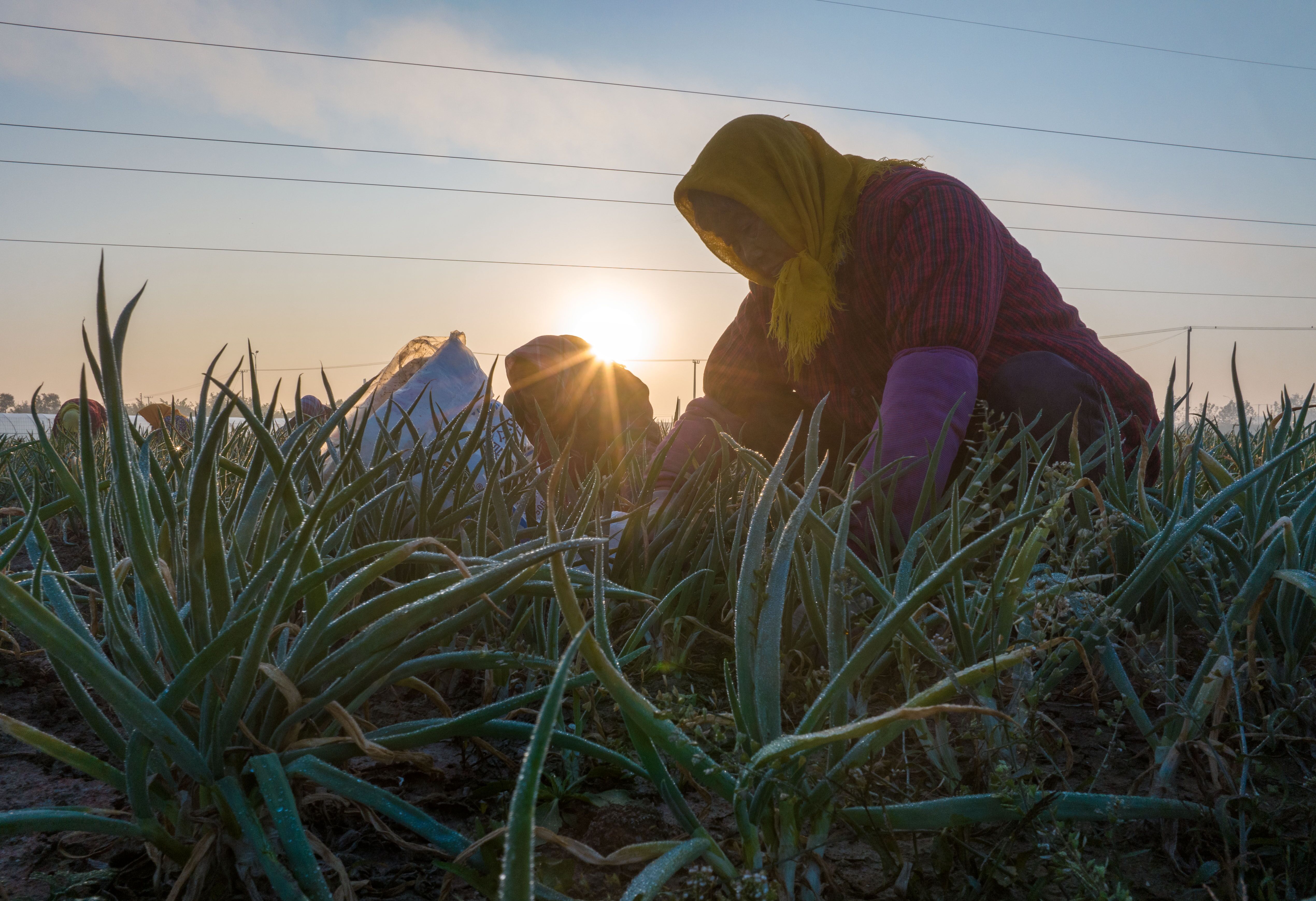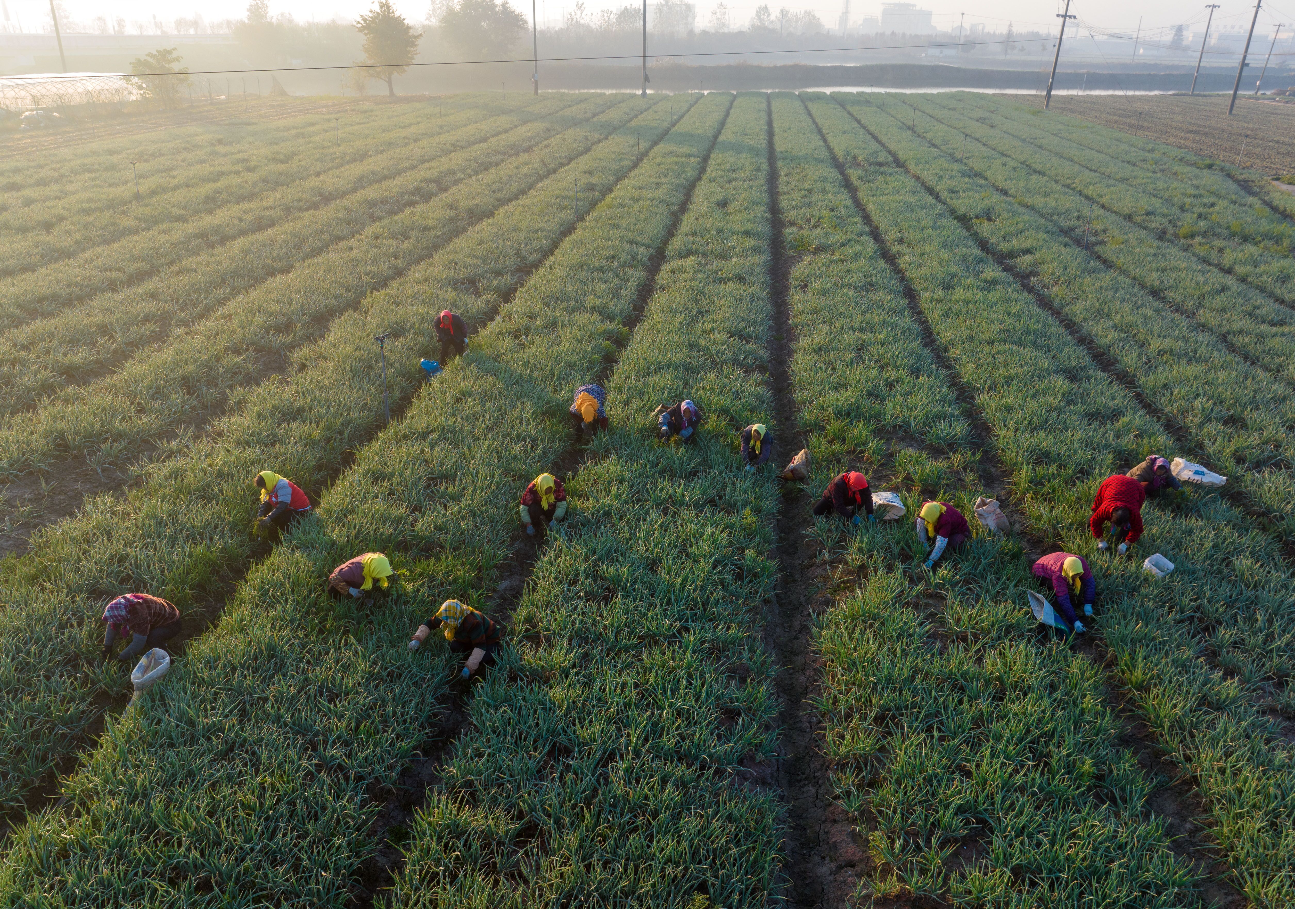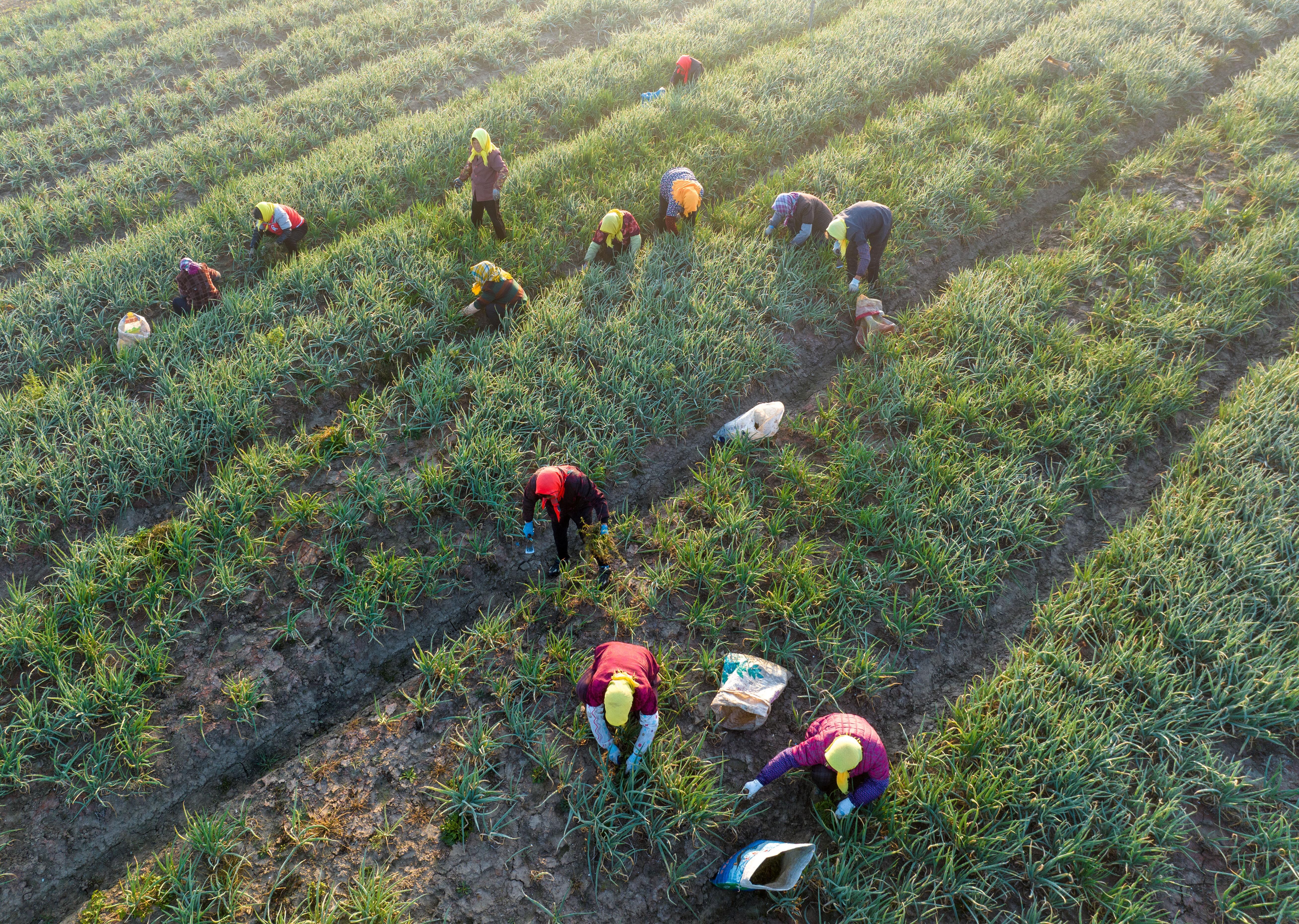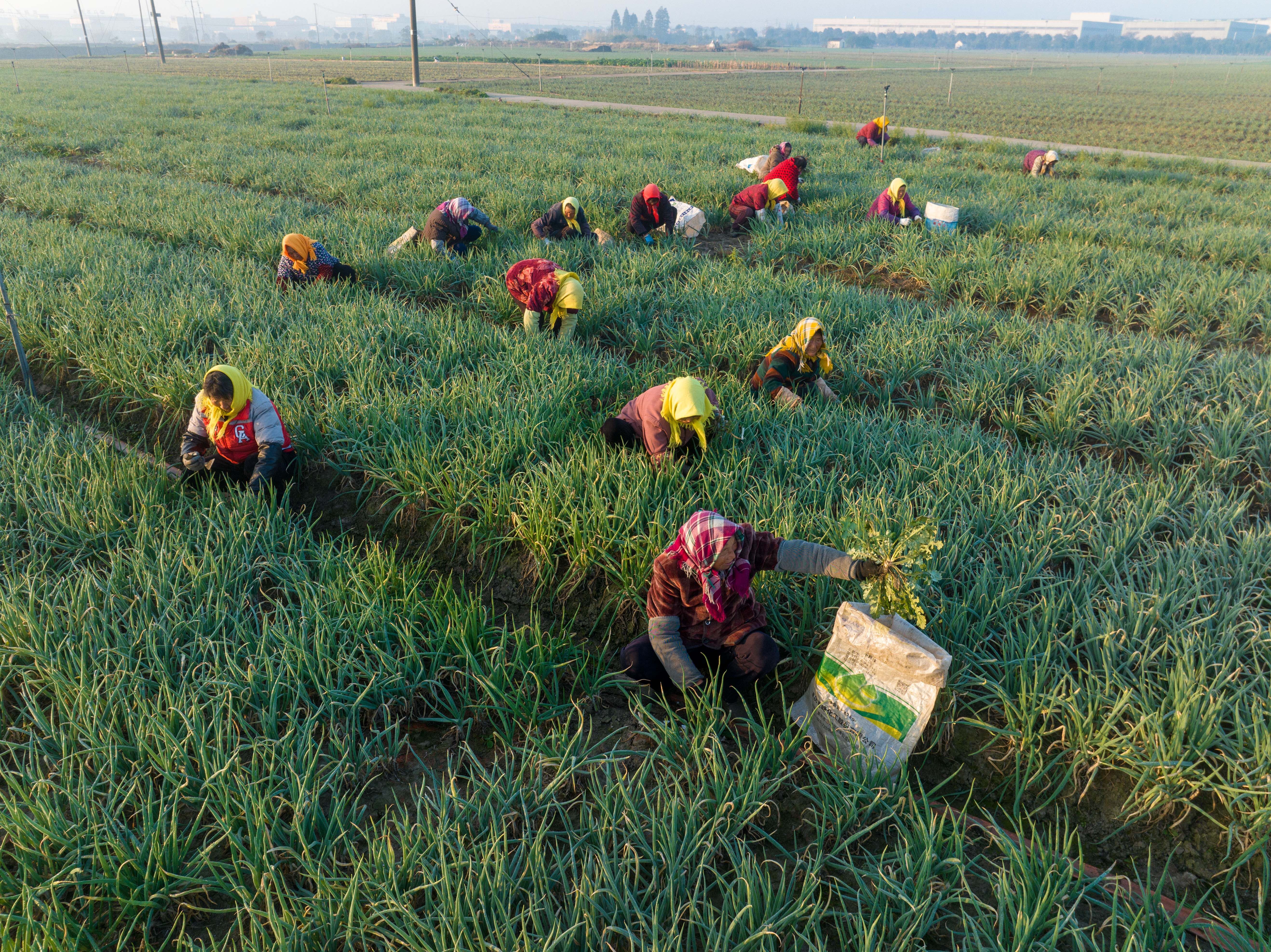 2023年11月22日,农民在兴化市兴东镇东鲍村香葱种植基地给香葱人工除草。