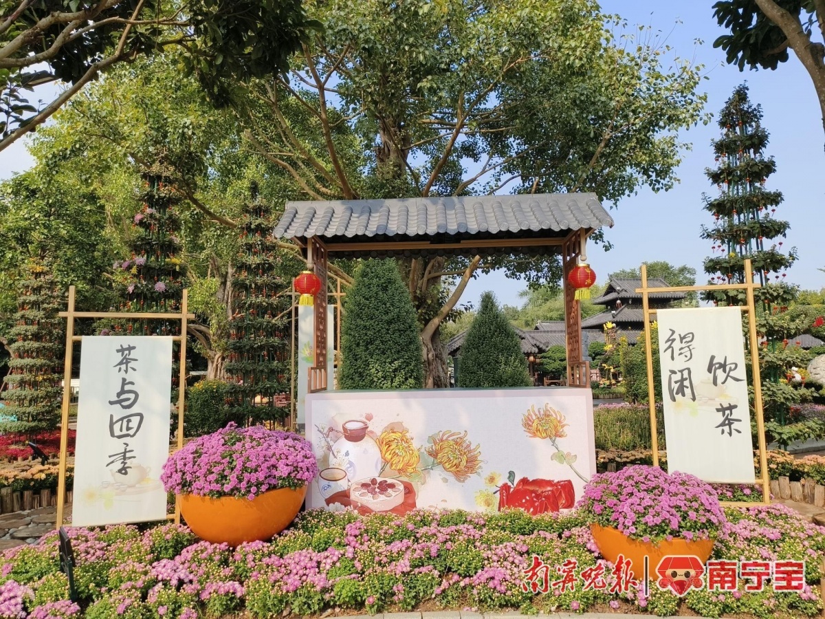 菊花展期间,景区还打造了风格独特的“菊里菊气”创意市集,现场布置多个充满菊花元素的展位和活动帐篷,汇聚南宁特色餐饮美食、文创手作等品牌商家,为市民游客带来味蕾与视觉上的双重体验。