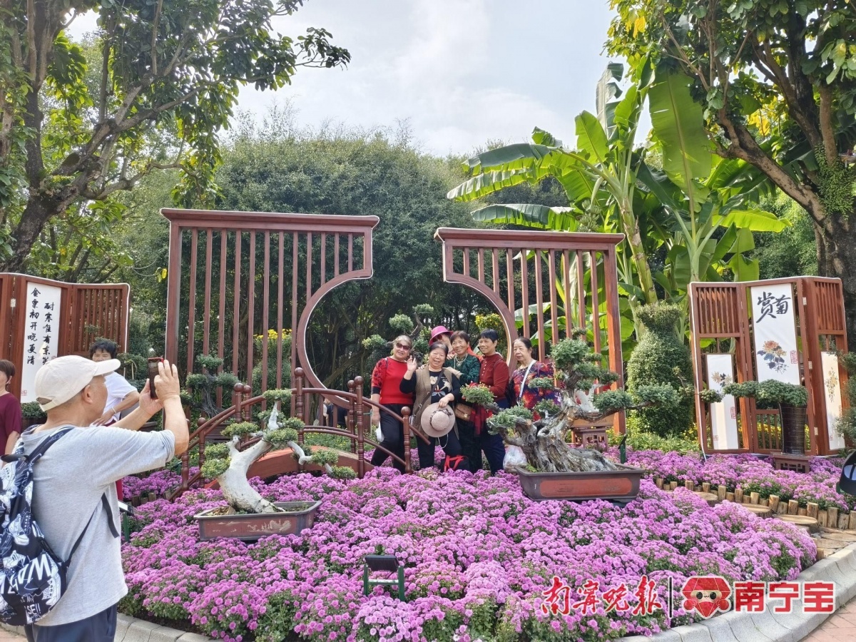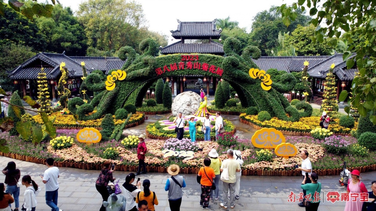 23日,记者在青秀山东盟友谊园看到,景区设置的菊花展园林景观展示吸引众多游客拍照打卡。景区采用立体花艺、动植物造型等展示手法进行造景,营造出错落有致、层次分明、类型丰富的菊展景观。现场布置《龙凤呈祥》《菊舞芳菲》《秋日品菊》《采菊东篱下》《菊意共赏》《江海联运》6组园林小品,展出了盆栽类菊花10万余盆约150个品种。