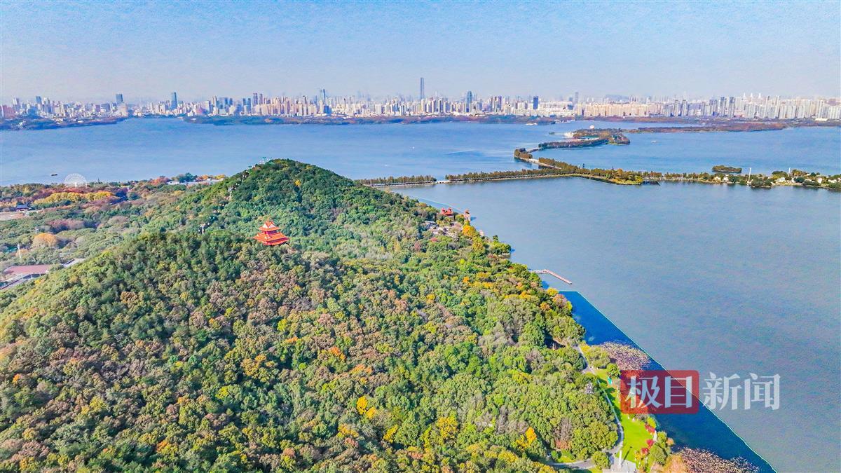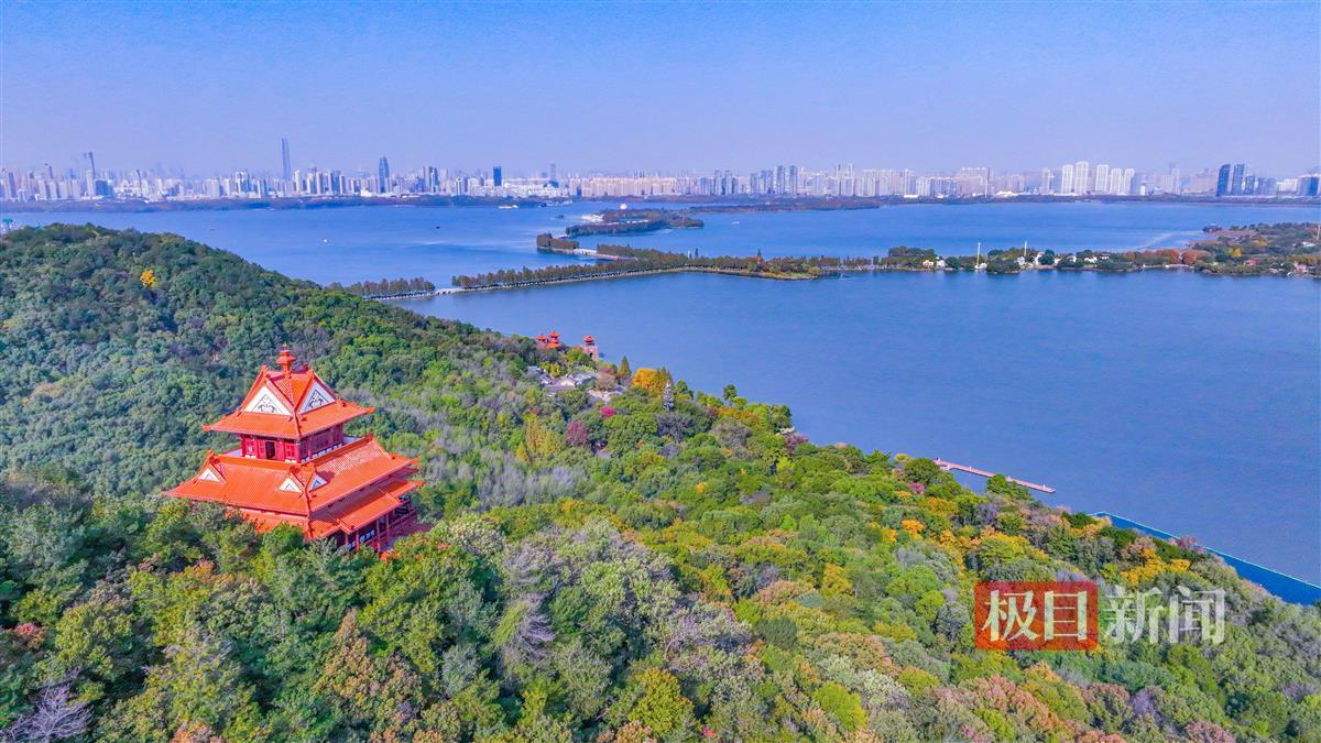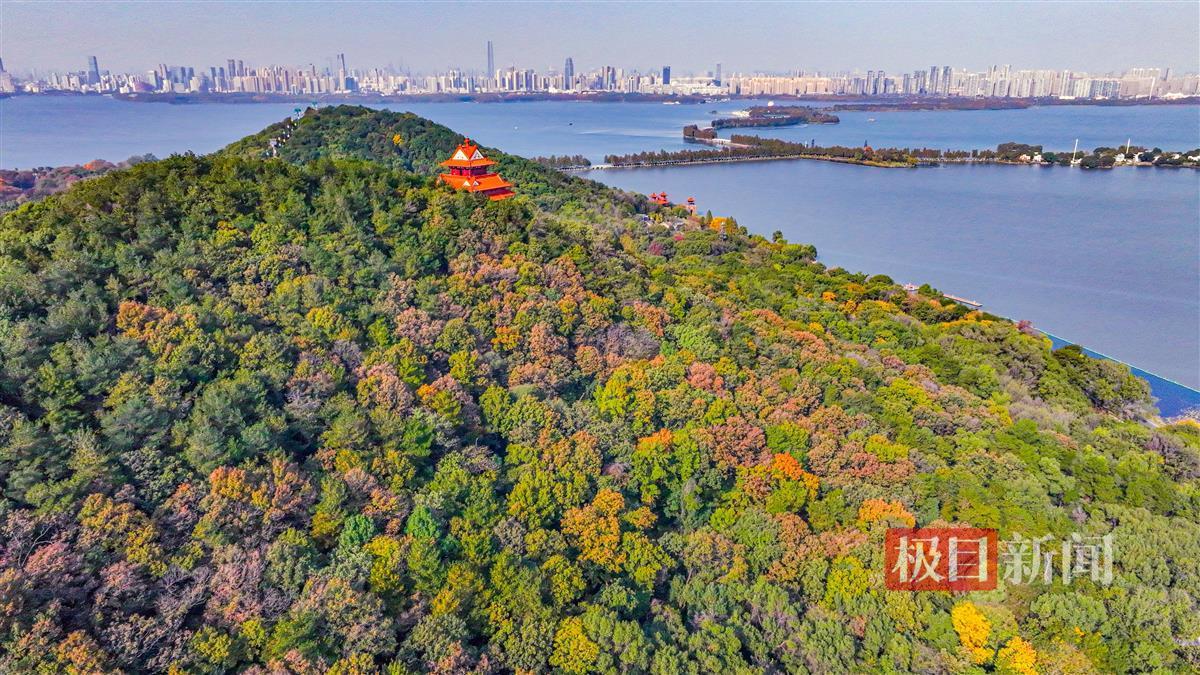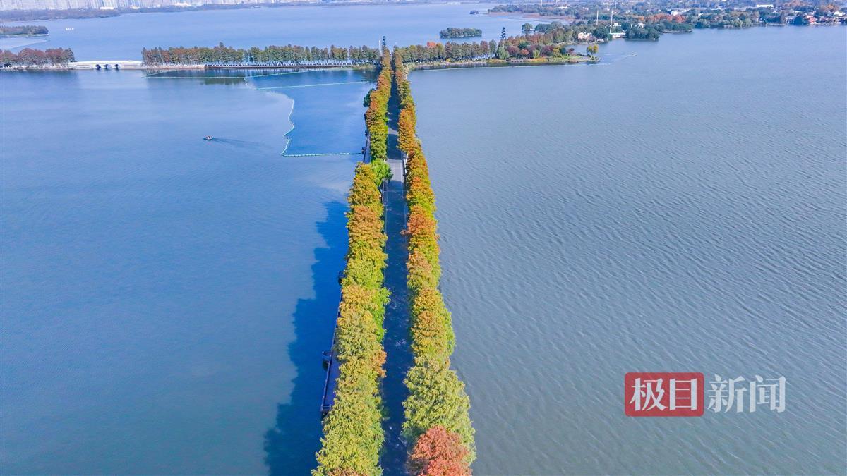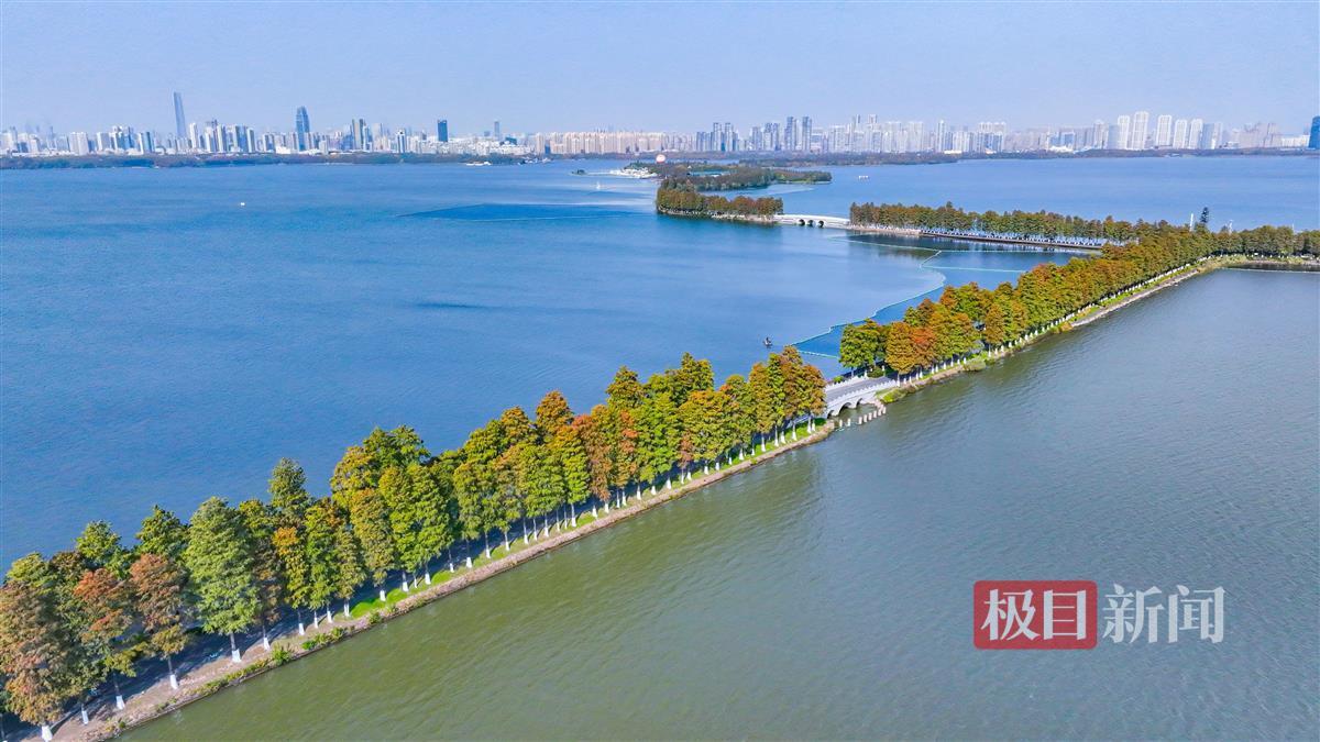 11月25日,初冬温暖的阳光照拂着武汉东湖。磨山密集、挺拔的树木,舒展着红、橙、黄、橘、绿的叶子,各种颜色交织在一起,呈现出色彩斑斓的独特风景,宛如大自然的调色盘。湖中长堤的杉林,在暖阳的照耀下,宛如一条金色的长龙,在湖面上盘旋;湖水与蓝天一色,把白云倒映在湛蓝的湖面上,好似湖光山水的底色。