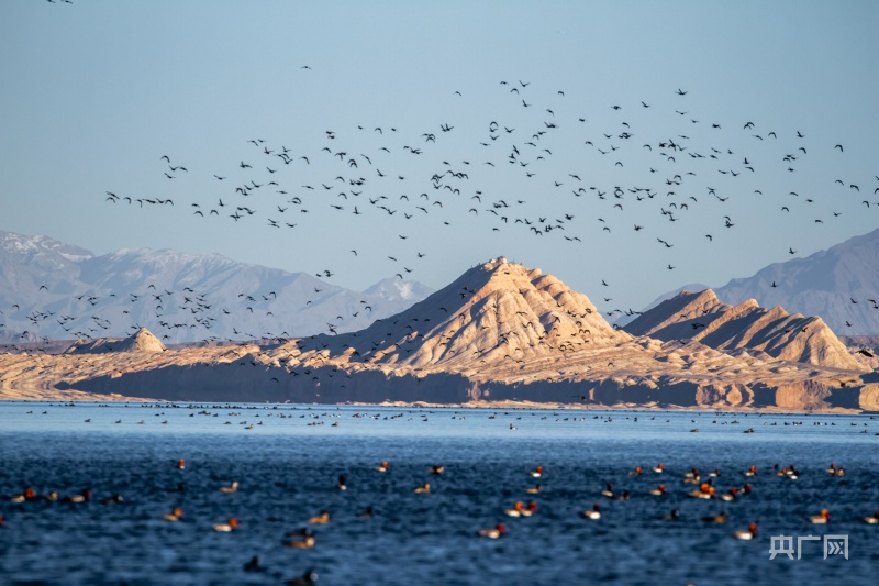 在可鲁克湖-托素湖自然保护区内飞翔和戏水的群鸟(央广网发 陈辅兴 摄)