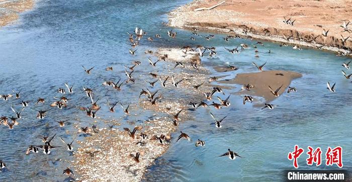 鸭儿从河面飞过,与清澈碧绿的库玛力克河一起,“绘就”了一幅绝美的画卷。韩文菁摄