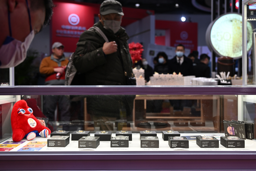 12月1日,参观者在博览会上的法国巴黎造币局展台上观看法国巴黎奥运会纪念币。新华社记者 李鑫 摄