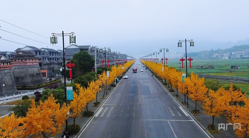 央广网毕节12月7日消息(记者任振国)初冬银杏黄,叶落满街巷。眼下,贵州省毕节市金沙县岩孔街道两侧的银杏已渐金黄,从深秋到初冬,随着气温渐低,夹道成排的银杏树整齐列于路边,为萧瑟的初冬平添一抹暖色。