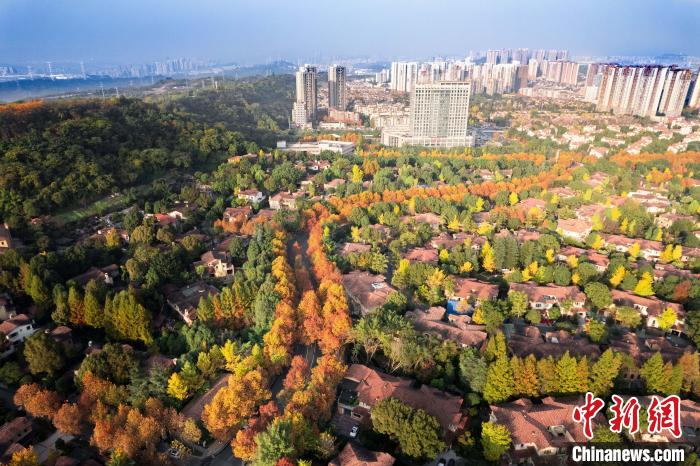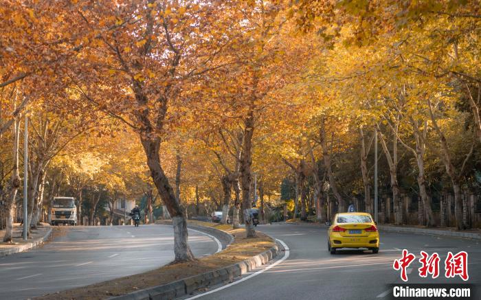 近日,重庆迎连日晴好天气,两江新区金山街道龙健路两侧梧桐渐次转黄,色彩斑斓。千余株梧桐形成长约2公里的“梧桐大道”,吸引不少市民游客打卡拍照。