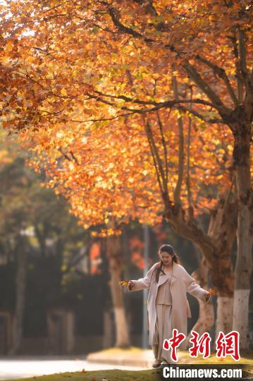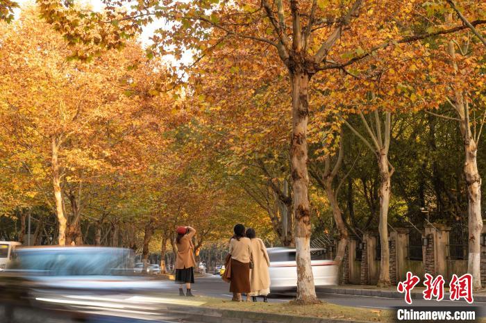 图为市民在梧桐树下打卡拍照。陈鑫摄