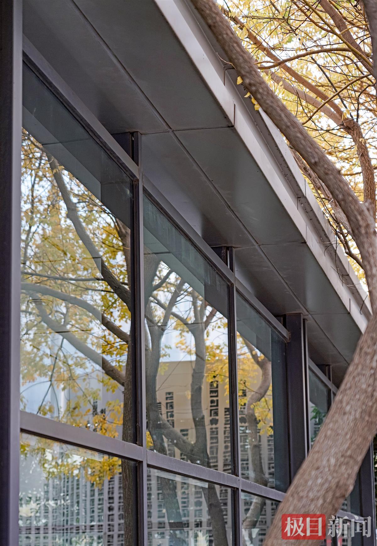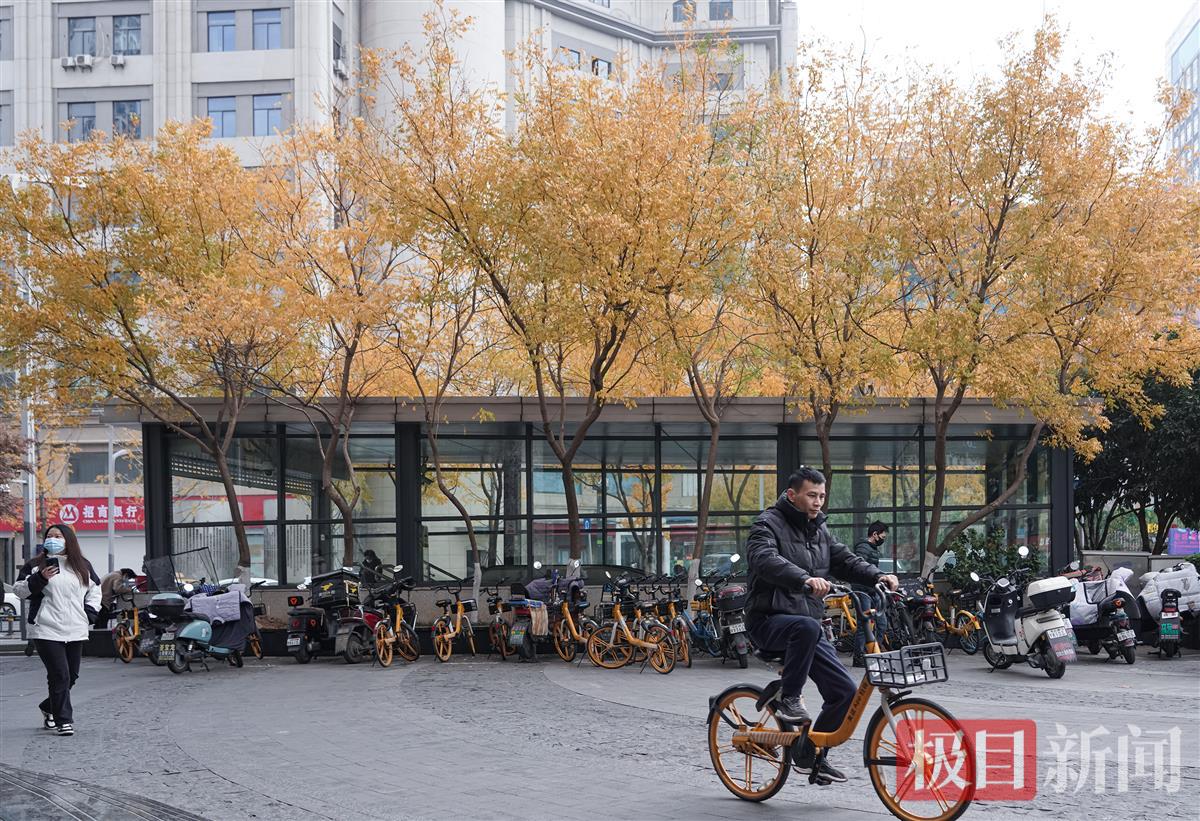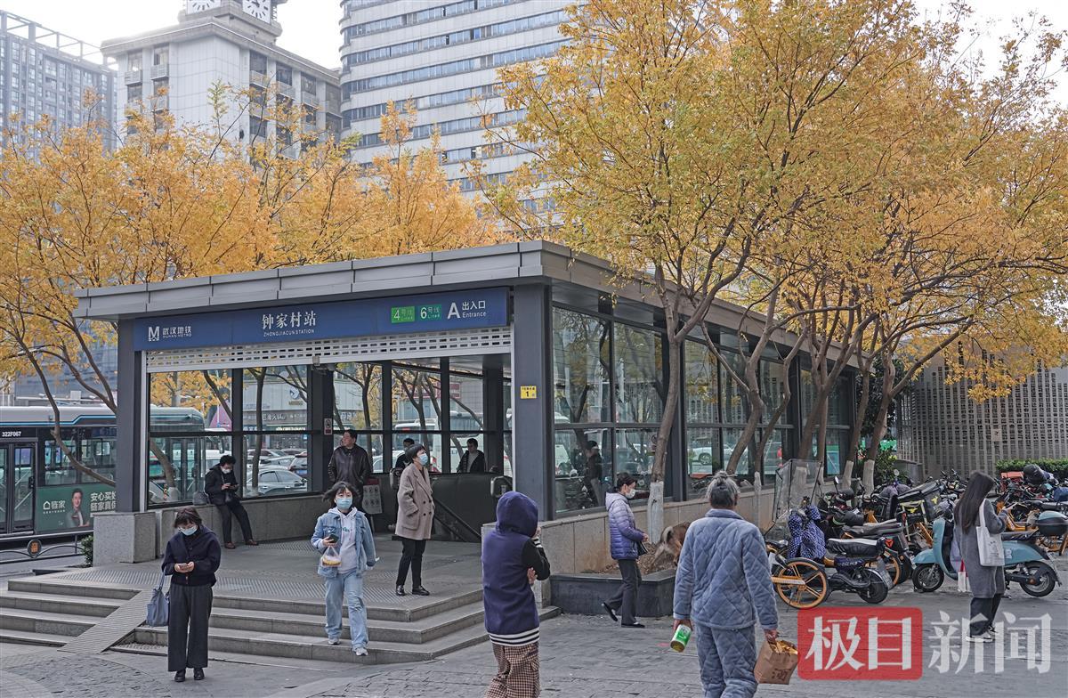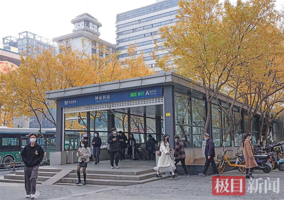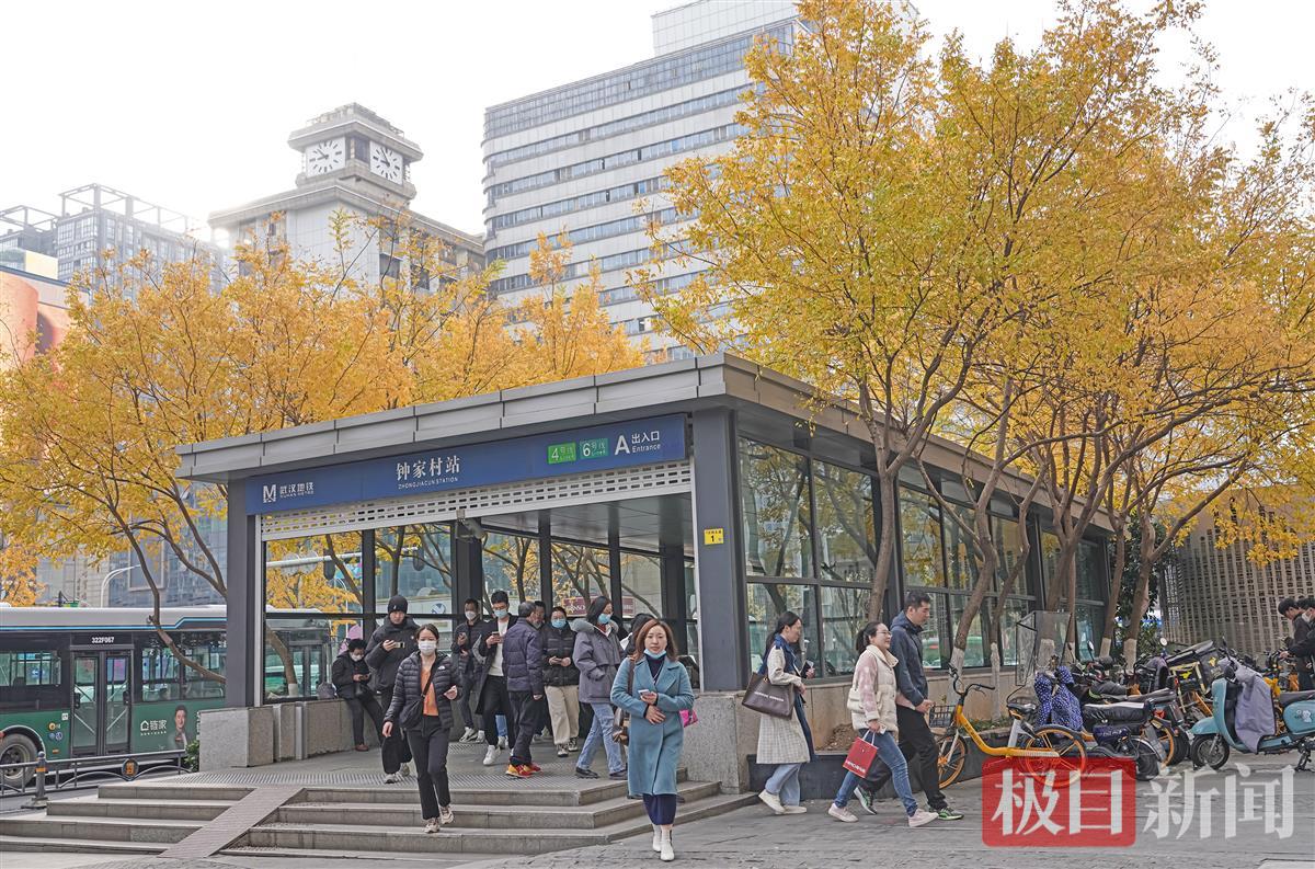 12月9日,武汉市汉阳区钟家村地铁站C出口,极目新闻记者看到,十来根楝树呈U形分布在站口的左右侧和后方,伸展的枝桠上,黄色的树叶簇拥在一起,远看就是一座金色的地铁站。车站仿佛一幅画,出入站口的乘客,有的从画中走出,有的走向画中。