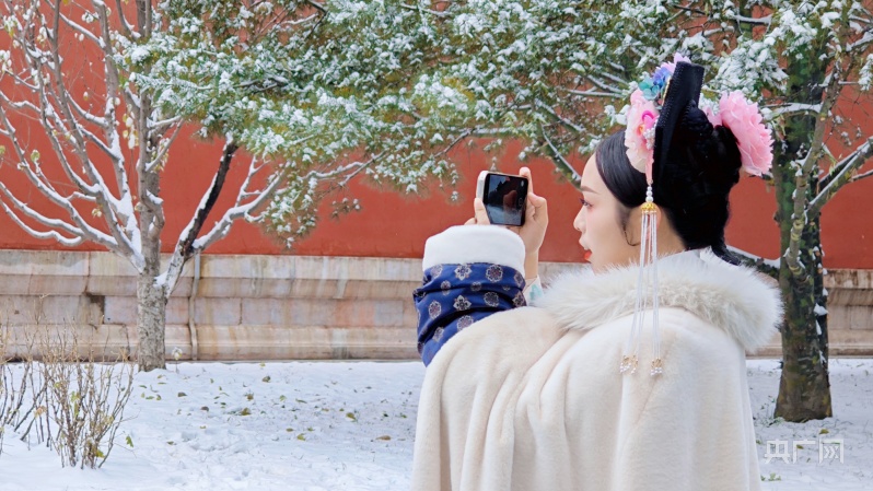 央广网北京12月11日消息(记者 朱冠安 王进文)昨夜不知雪深重,一座宫阙一座楼。12月10日晚,北京迎来今冬初雪,今晨降雪仍在继续。金瓦白雪,红墙银衣,600多年的宫殿在一场雪后别具魅力,历史的况味变得格外浓重。白雪镶红墙,碎碎坠琼芳,在雪中,故宫安静得不动声色。一抬头,旧时宏伟的建筑落满了今时的白雪,那悠长的时光和时光里的故事,在飞舞的雪花中如同梦境般浮现又消散。