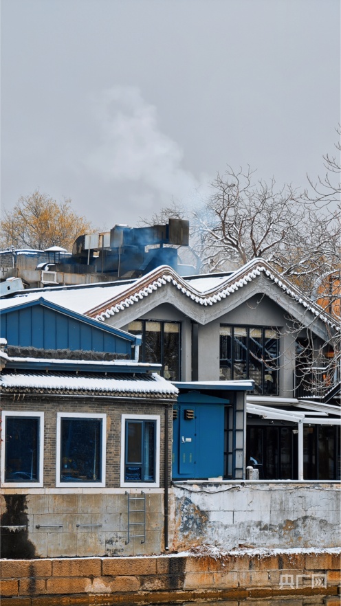 护城河边,几缕炊烟与白雪相映成趣(央广网记者 朱冠安 摄)
