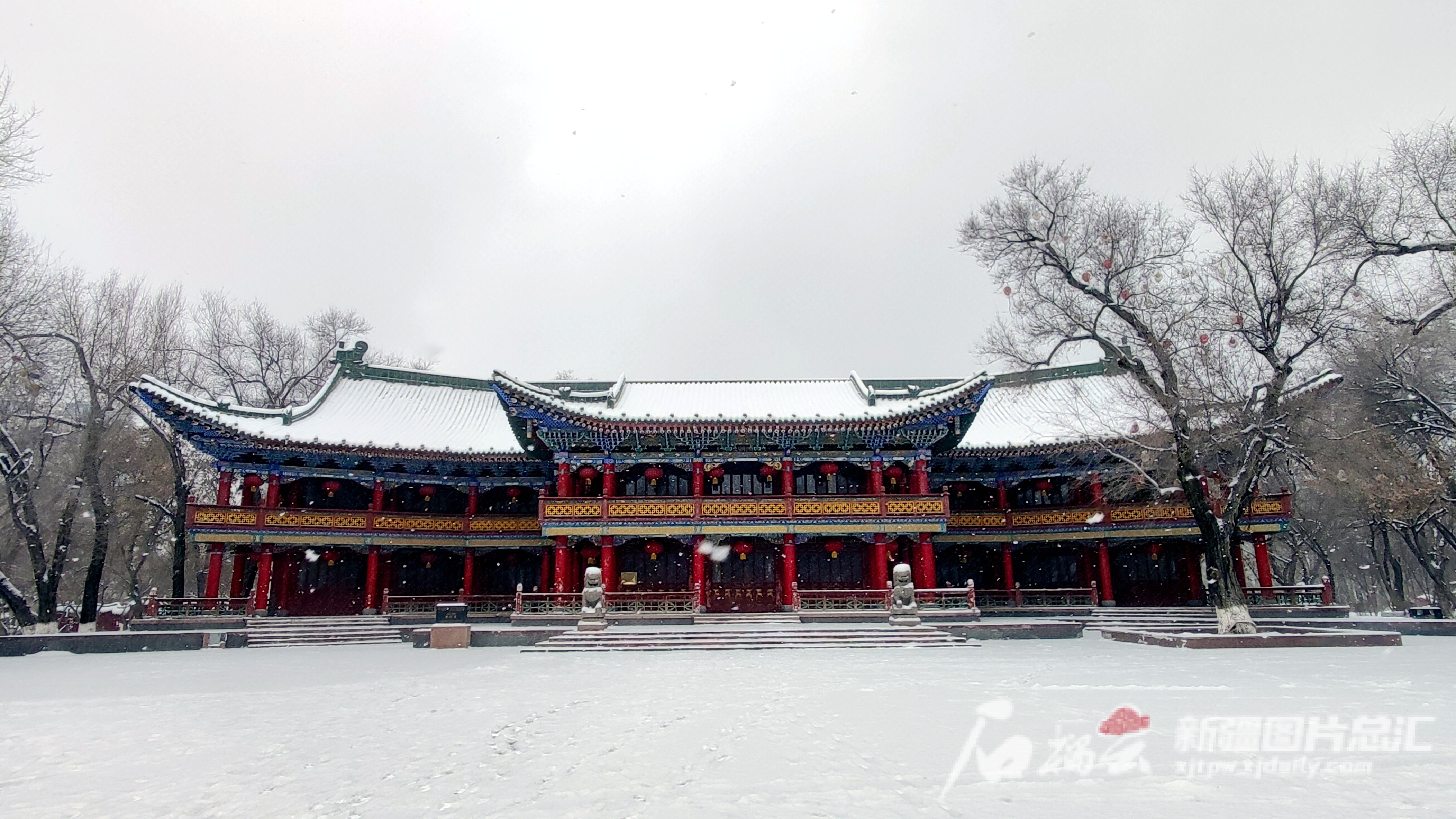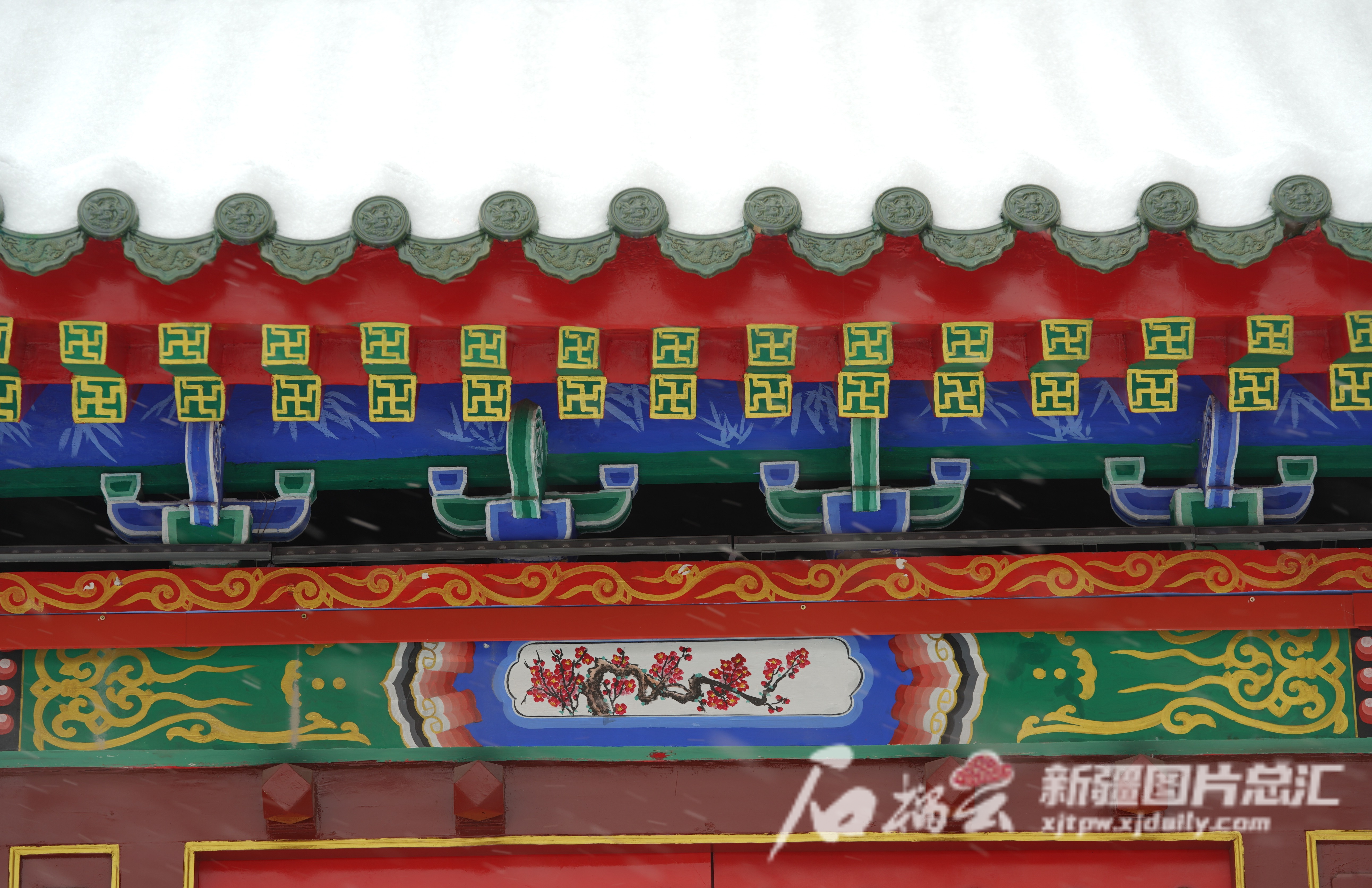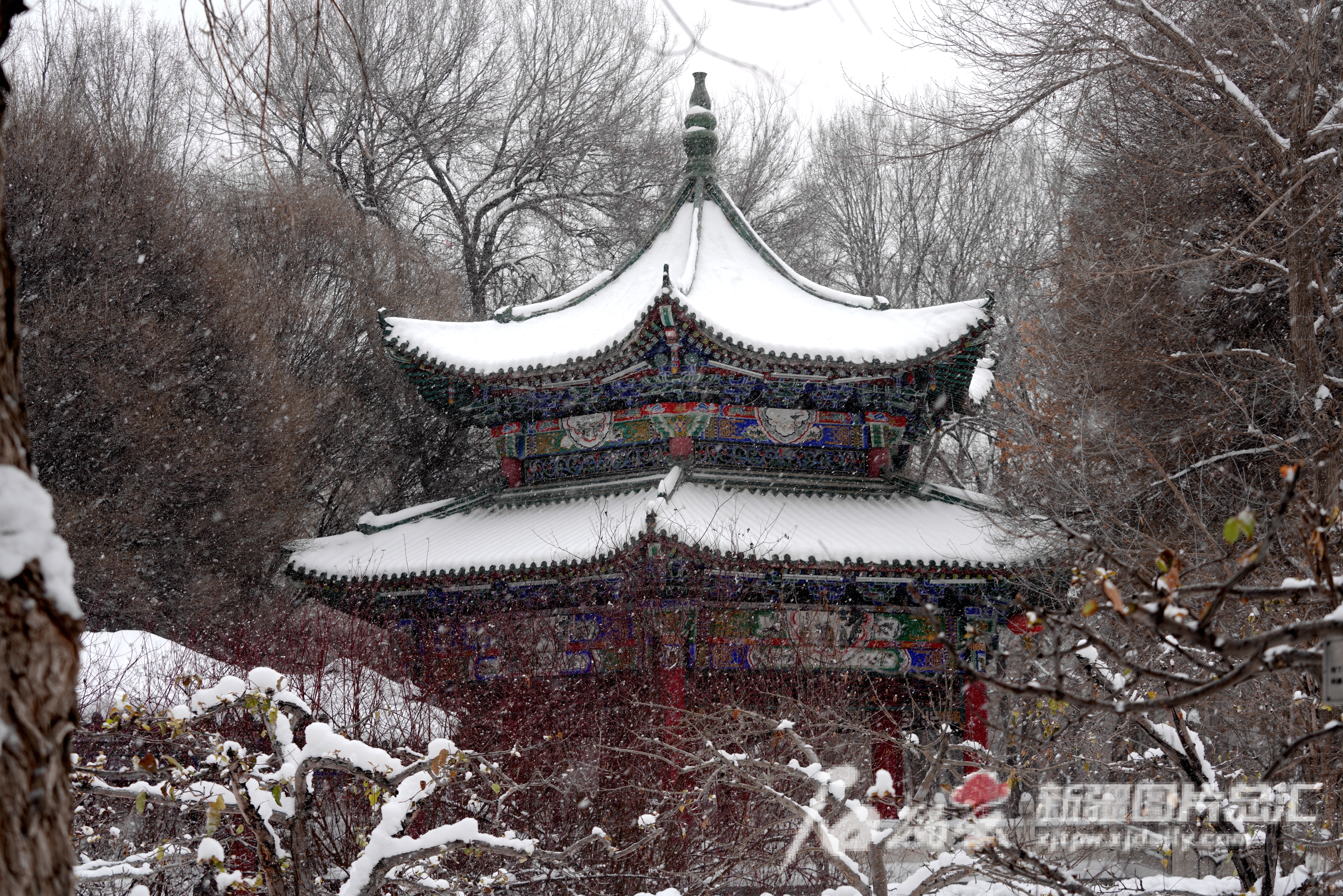12月12日,乌鲁木齐人民公园建筑的红墙绿瓦,在白雪的衬托下,显得更加明艳。天山网-新疆日报记者张万德摄