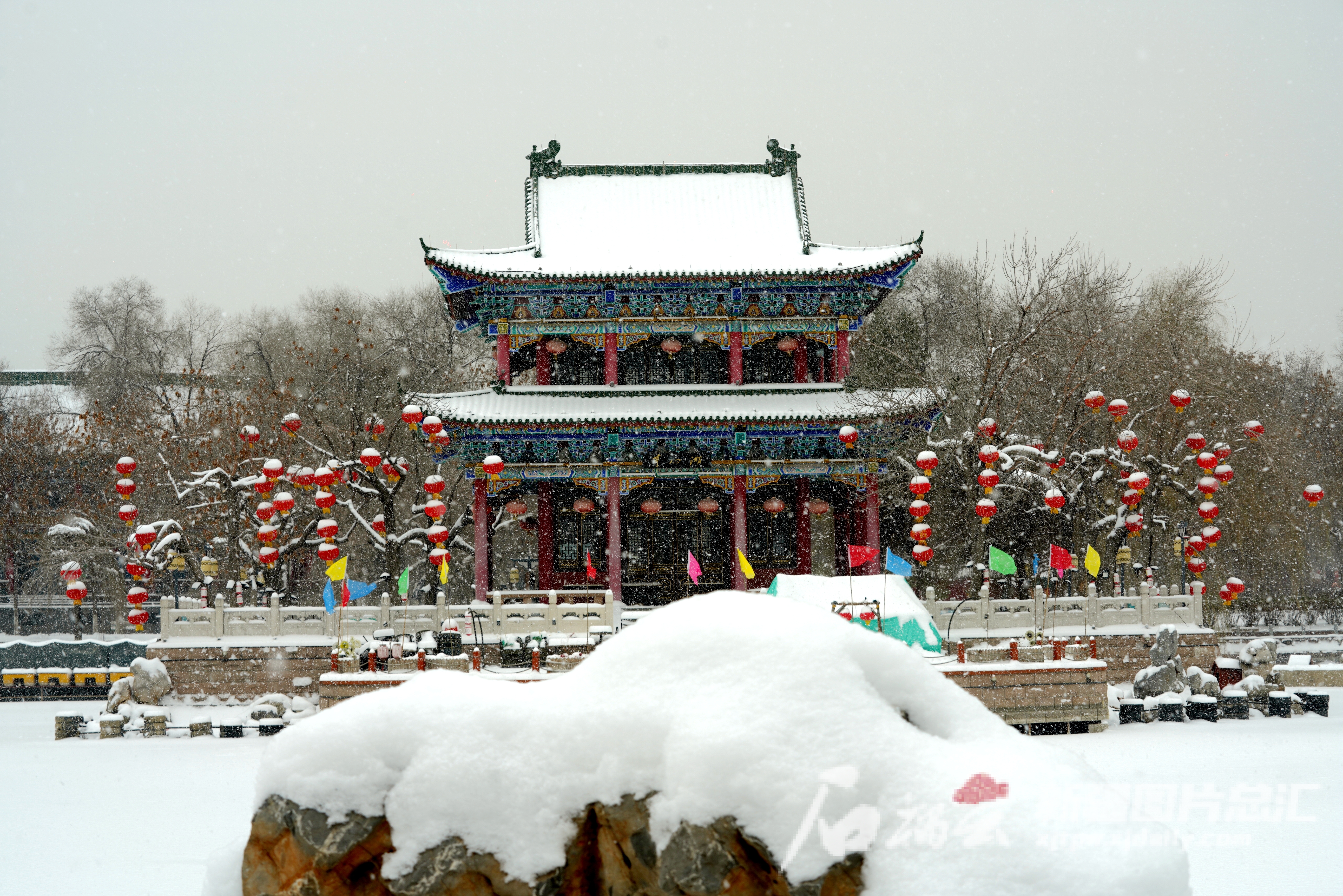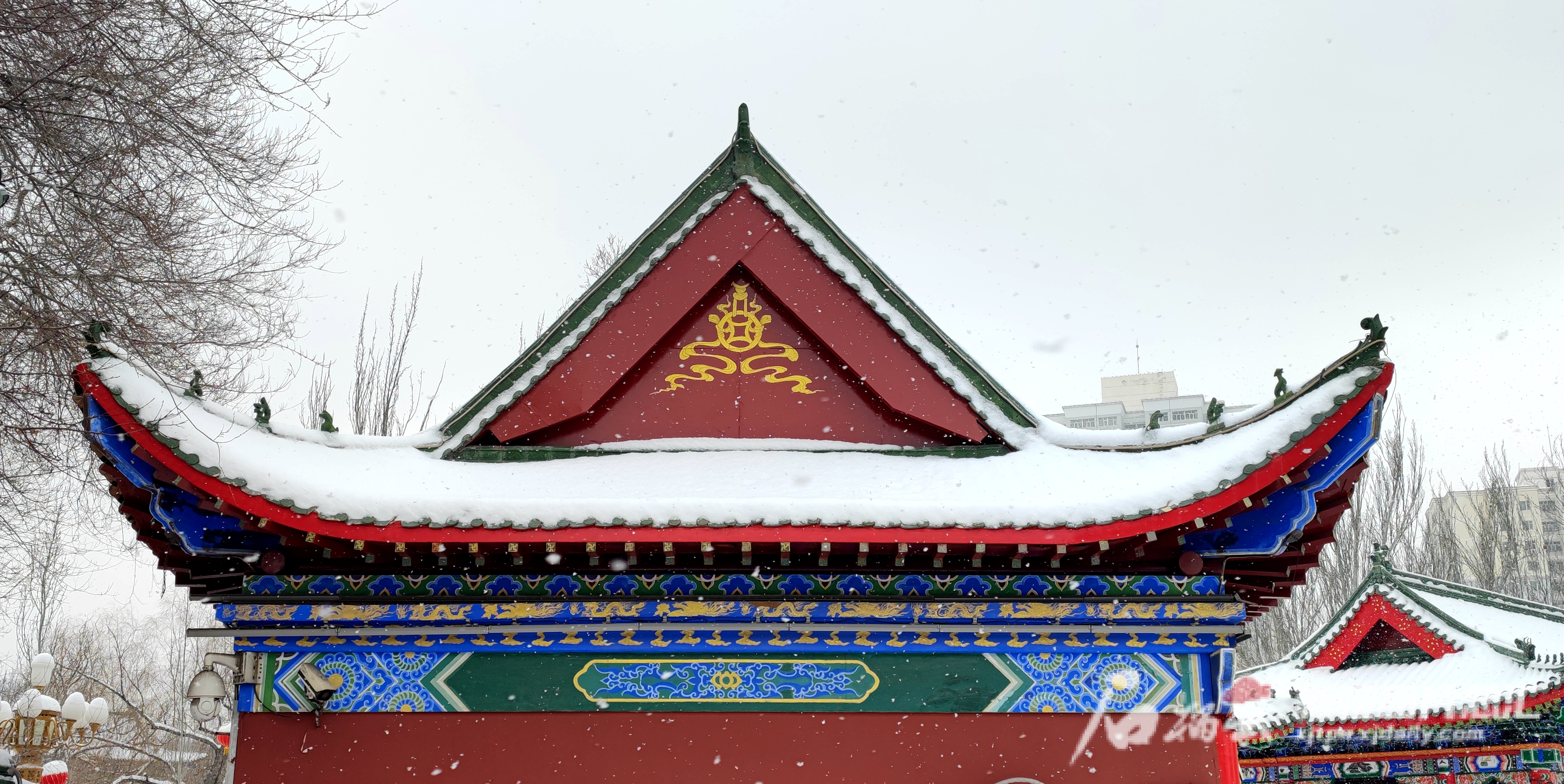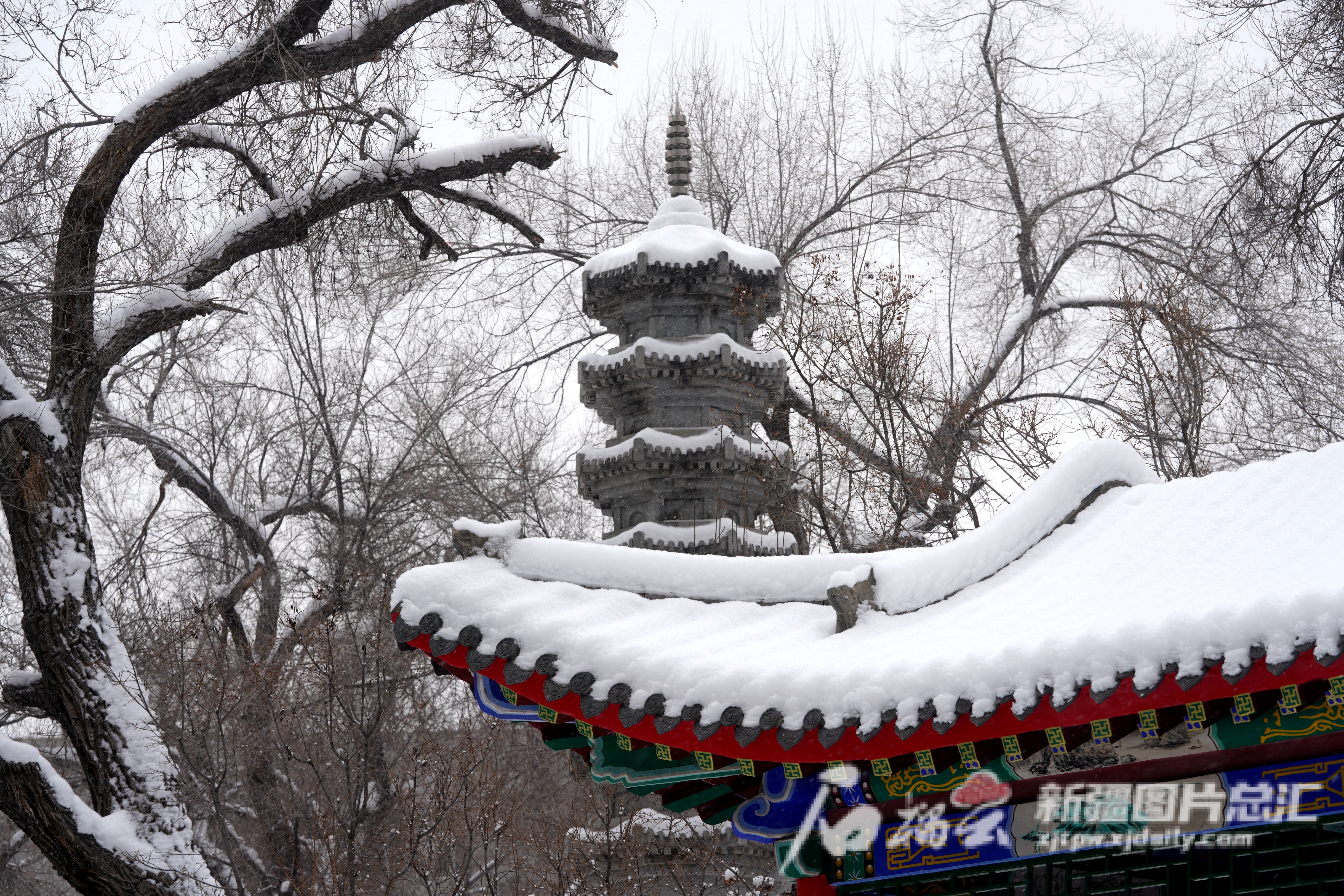 12月12日,乌鲁木齐人民公园建筑的红墙绿瓦,在白雪的衬托下,显得更加明艳。天山网-新疆日报记者张万德摄