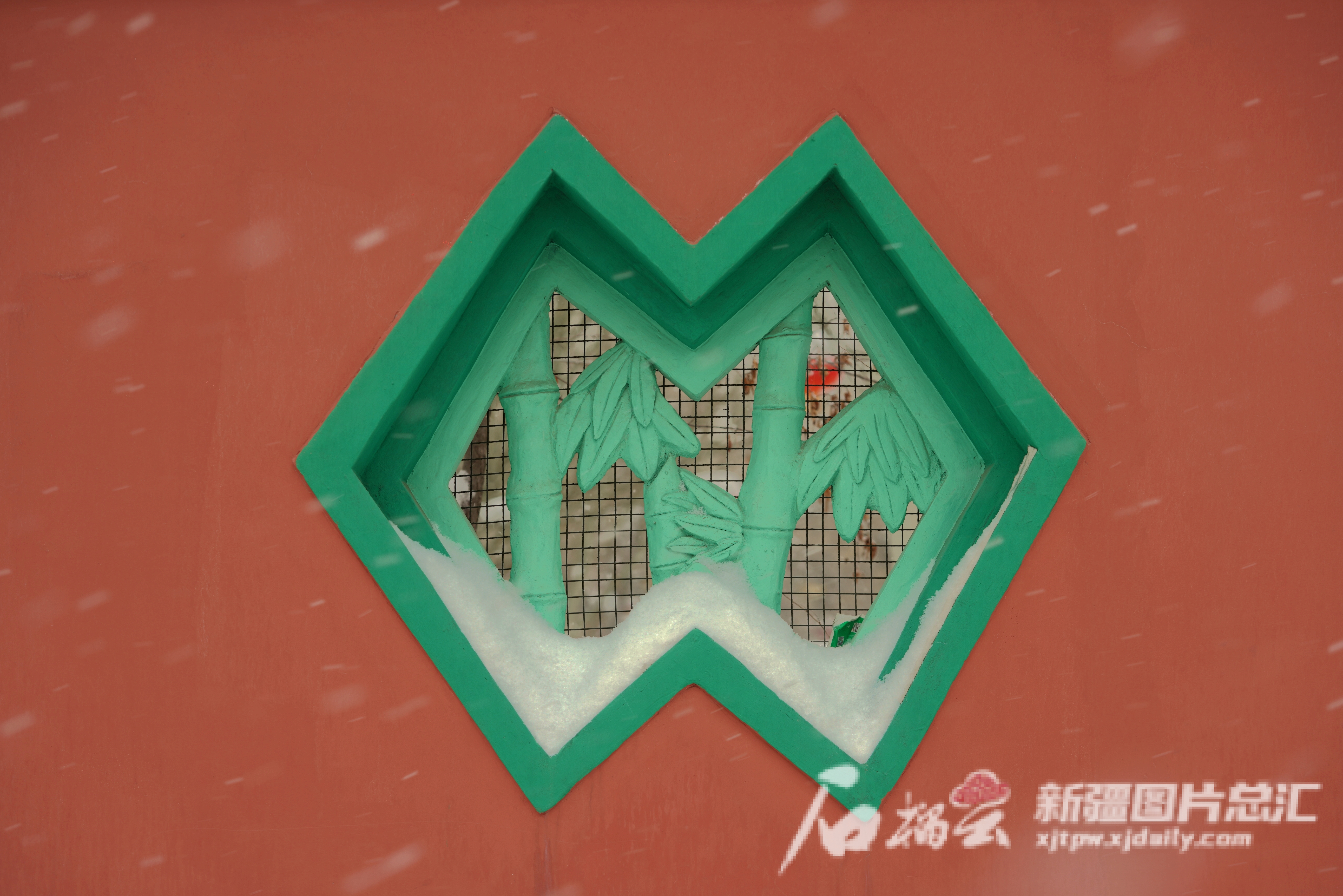 12月12日,乌鲁木齐人民公园建筑墙上的窗棂纹样,落满积雪。天山网-新疆日报记者张万德摄