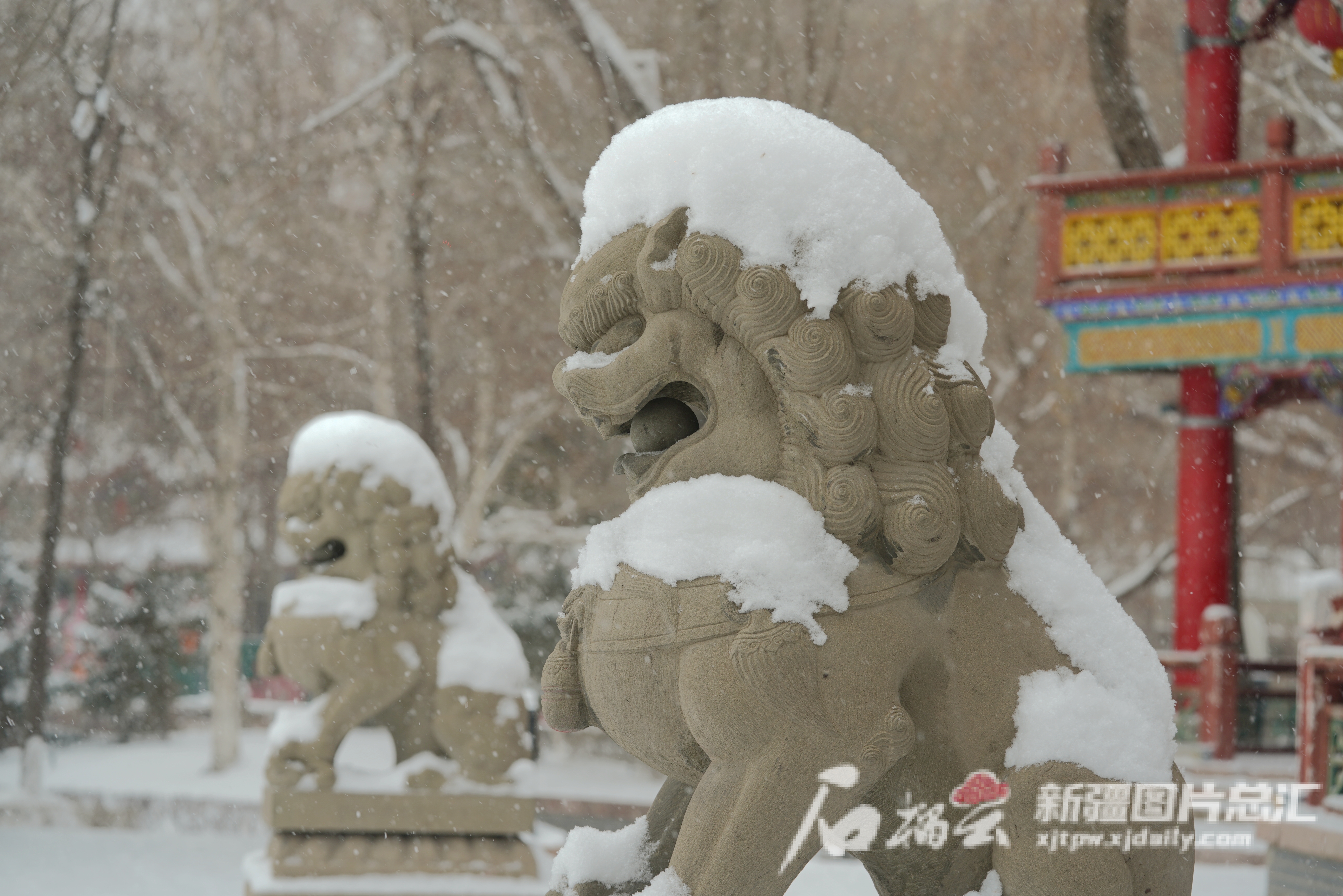 12月12日,乌鲁木齐人民公园门前的石狮子落满积雪,憨态可掬。天山网-新疆日报记者张万德摄