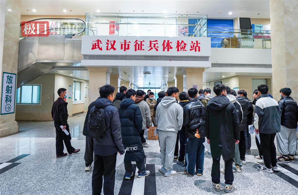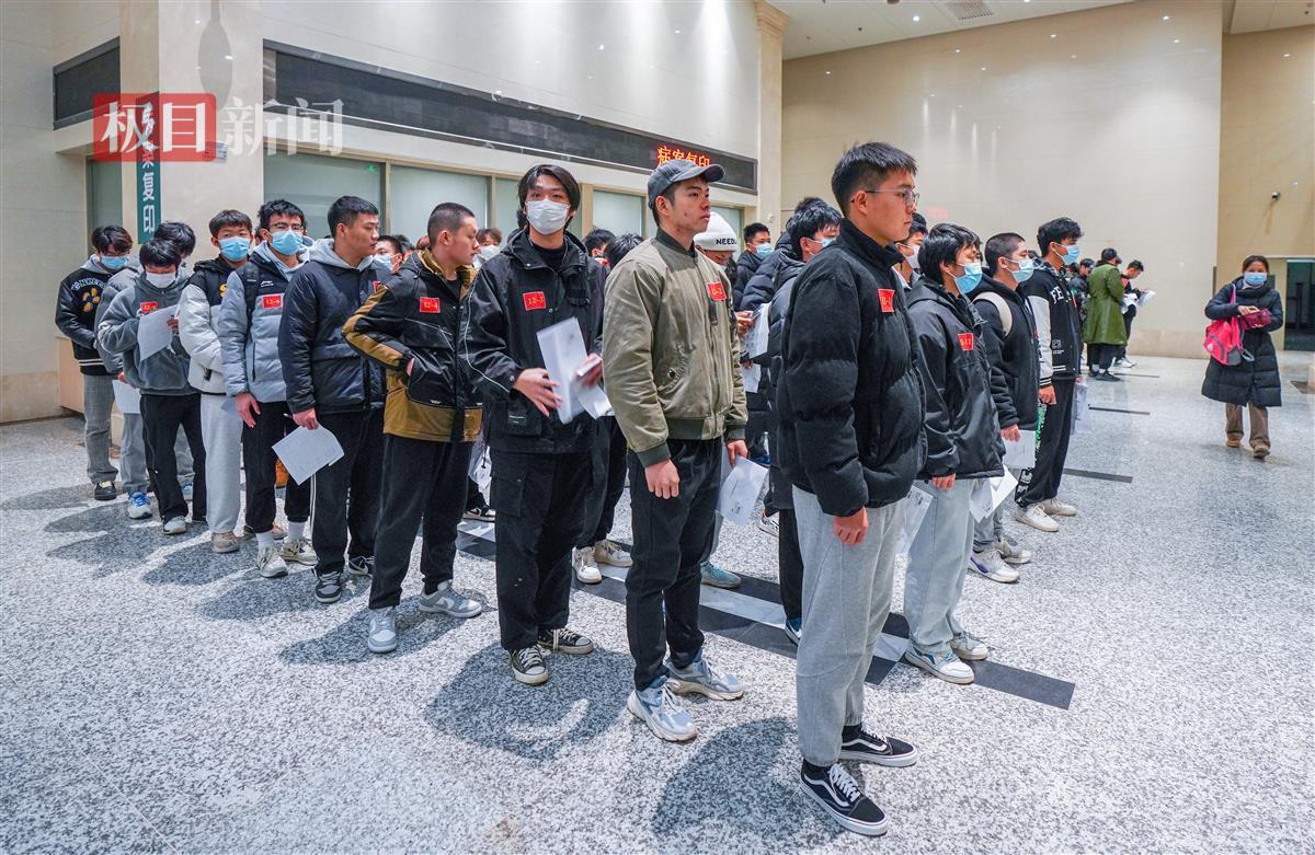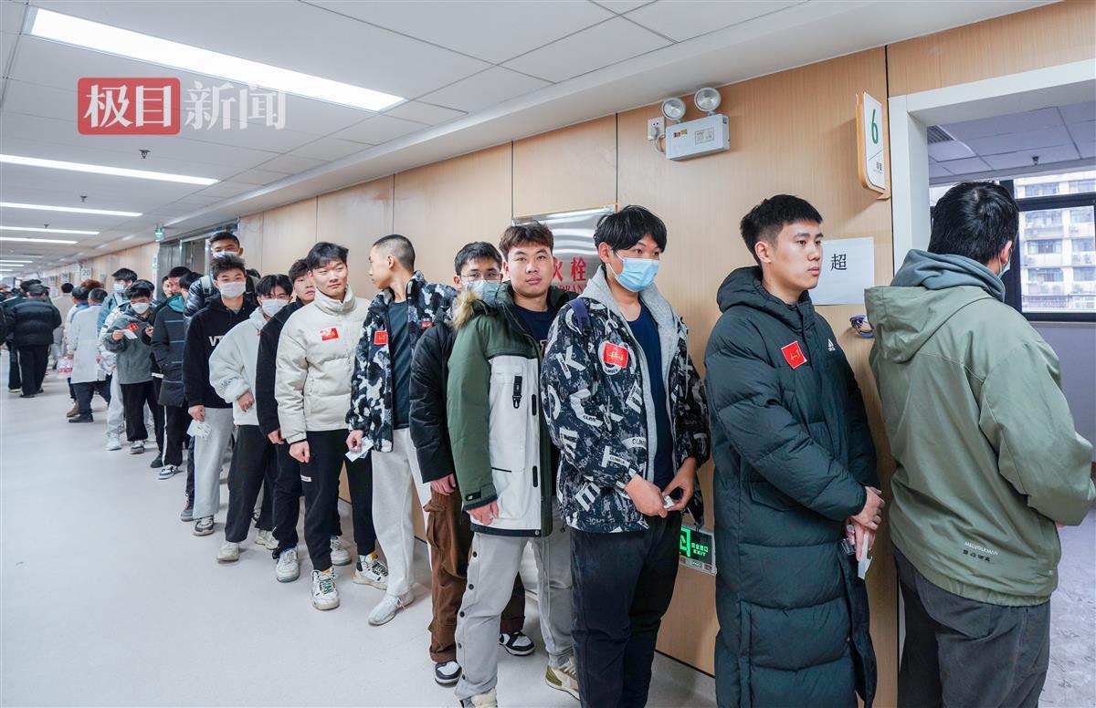 当天上午9时许,极目新闻记者现场看到,在工作人员有条不紊地组织下,应征青年们手拿体检表,分组在各个诊室门口排队接受身体检查。