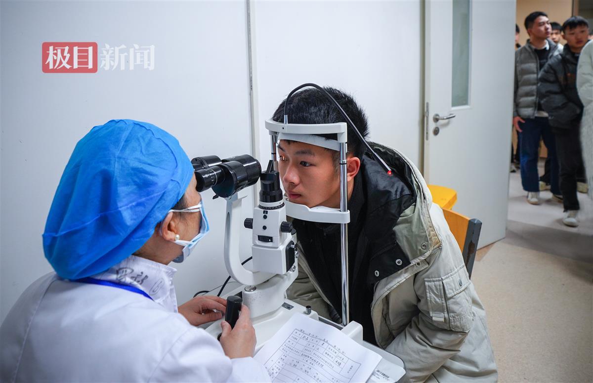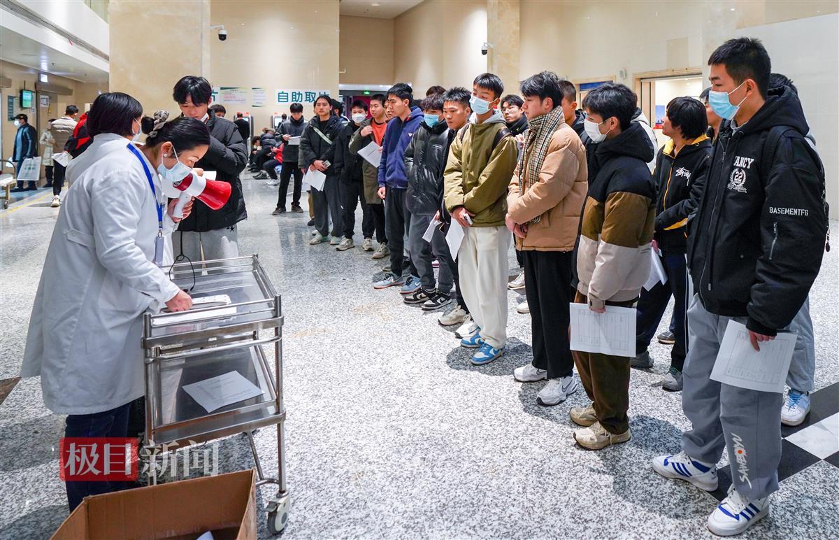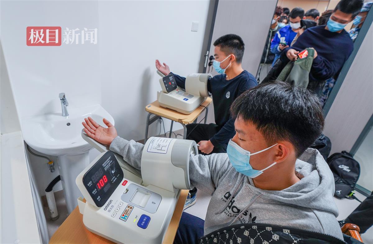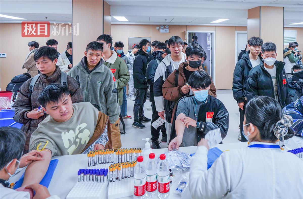 当天上午9时许,极目新闻记者现场看到,在工作人员有条不紊地组织下,应征青年们手拿体检表,分组在各个诊室门口排队接受身体检查。