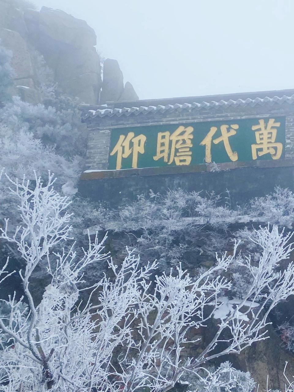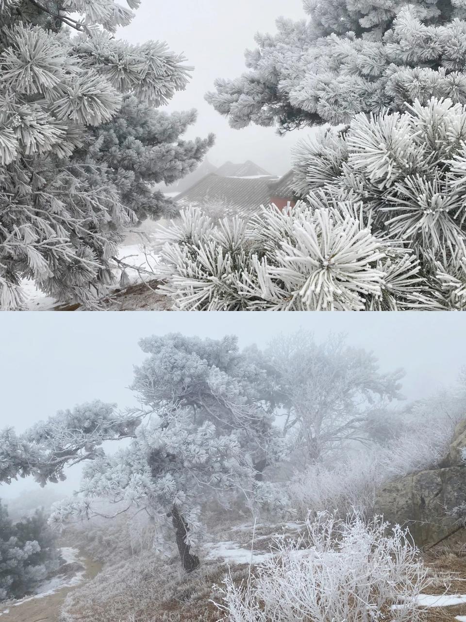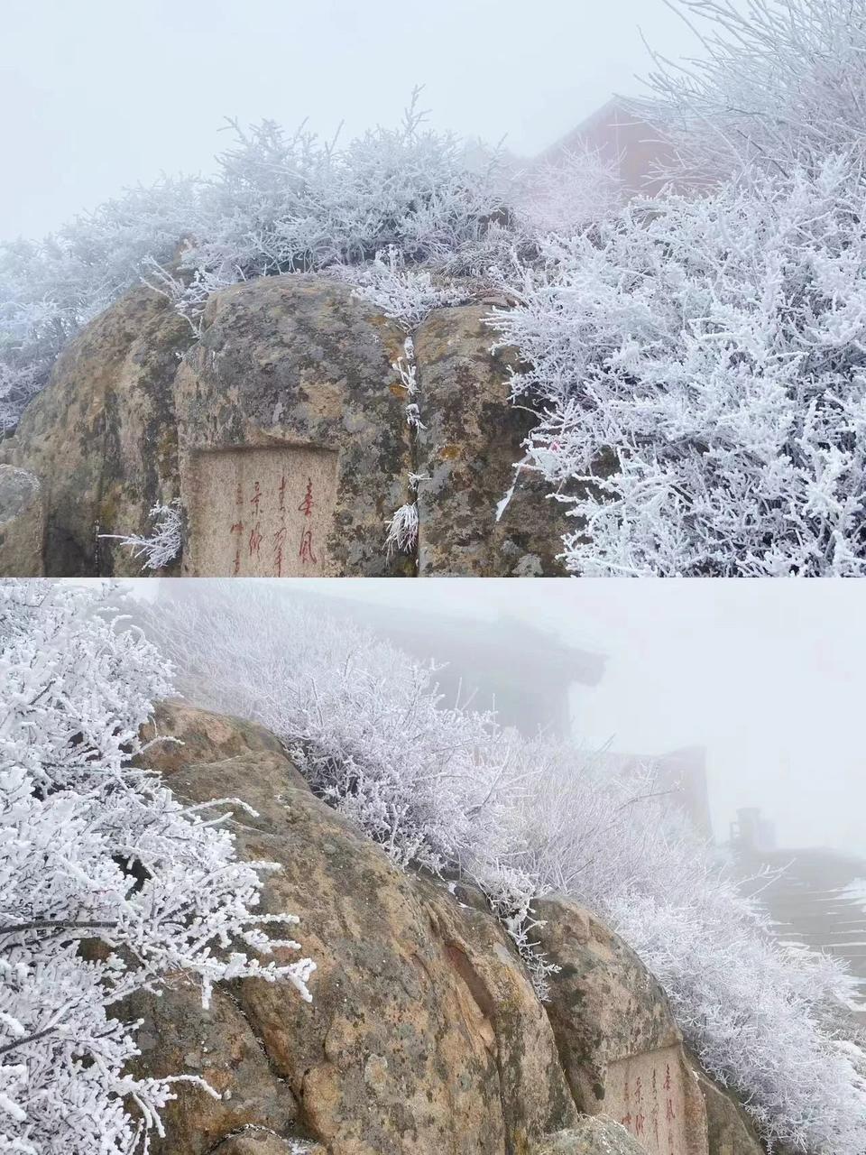 每年冬季,泰山都会出现雾凇景象。雾凇,俗称树挂,它非冰非雪,是低温时空气中水汽直接凝华,或过冷雾滴直接冻结在物体上的乳白色冰晶沉积物。雾凇形成需要低气温,并且水汽又很充分的环境,能同时具备这两个形成雾凇的自然条件极为难得。