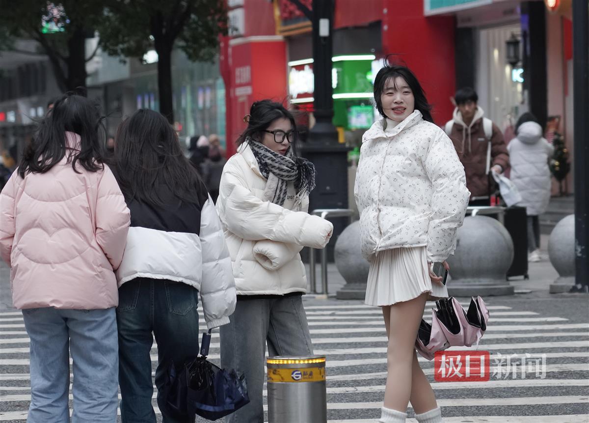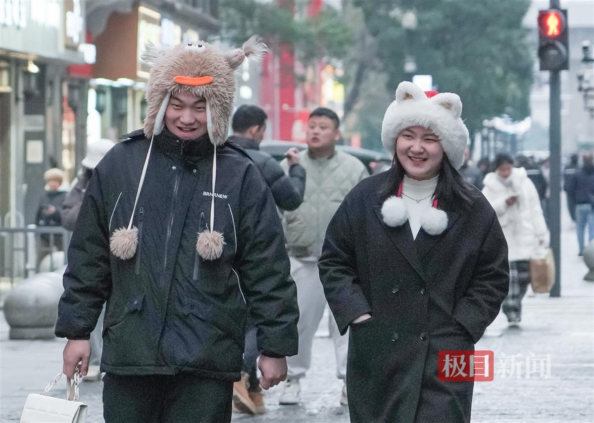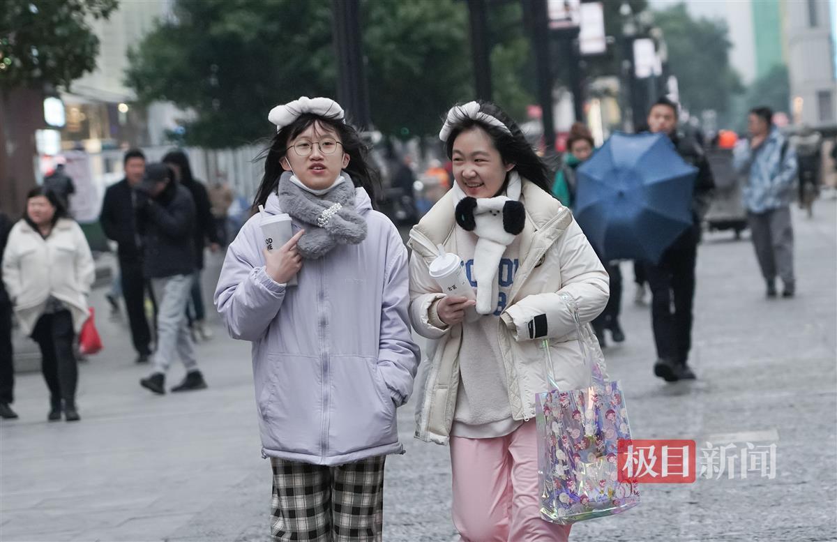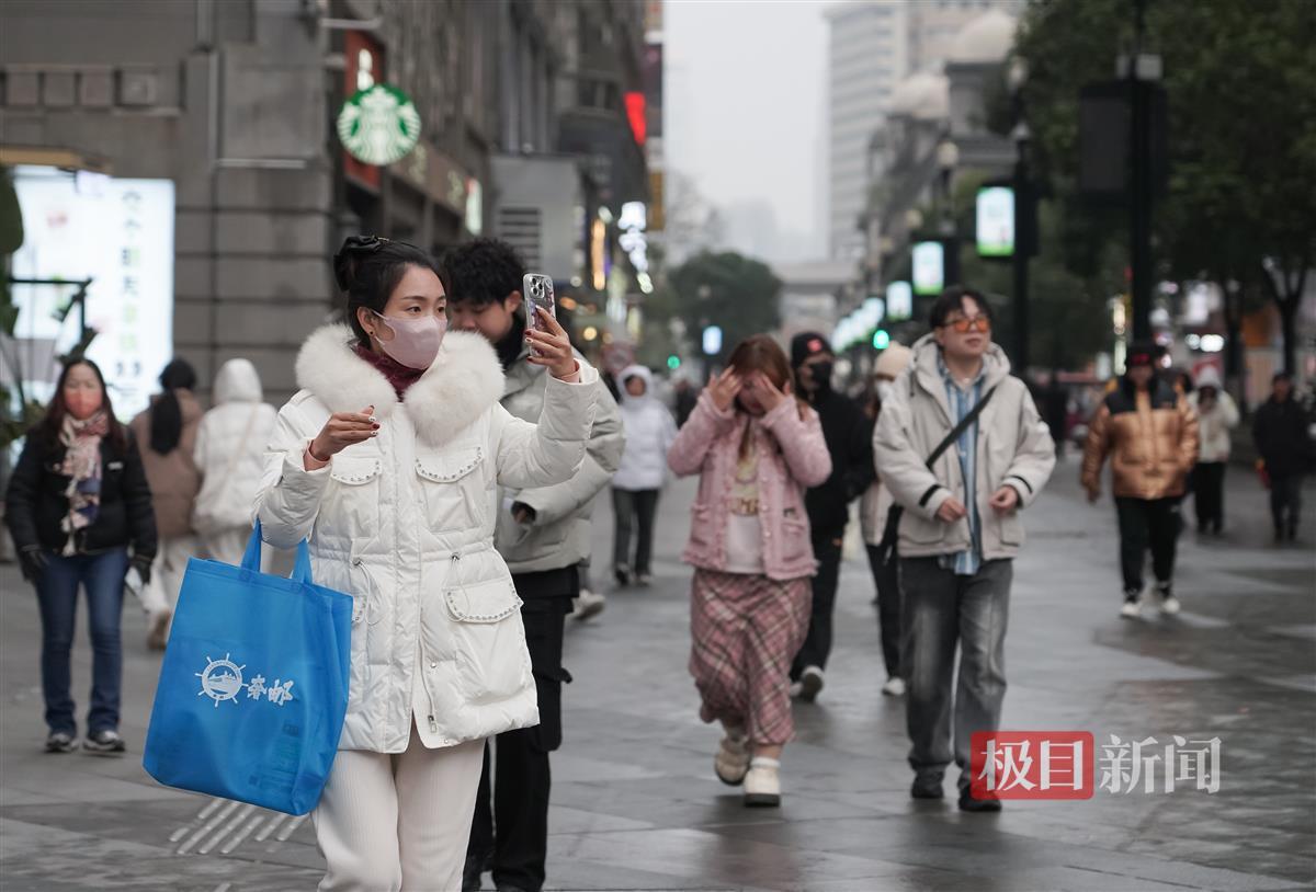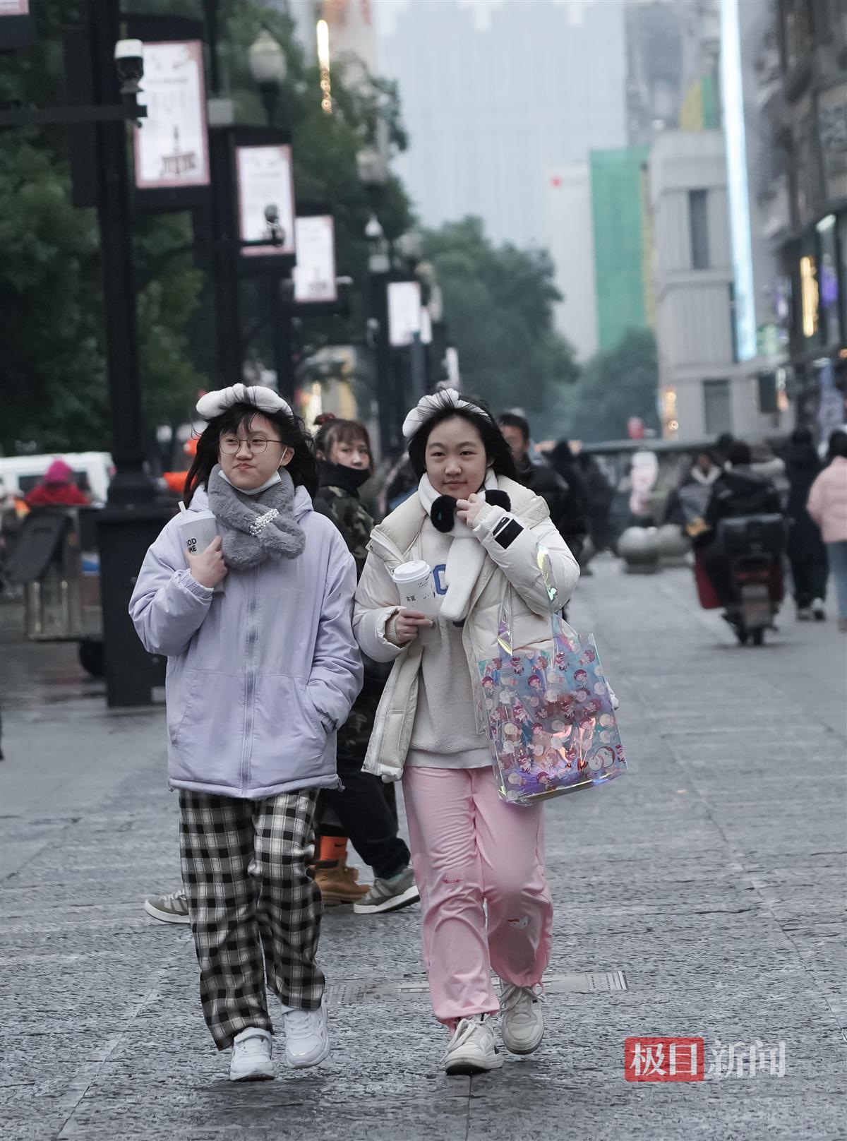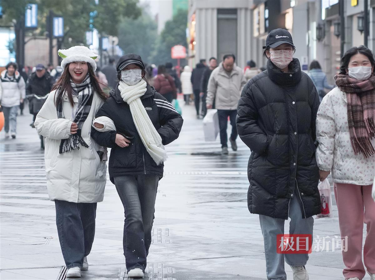 12月15日,武汉江汉路步行街,寒风冷雨挡不住游客的步伐,来来往往的人全副武装抗寒防冻,各种时尚大方的衣服开启了步行街的“冬装秀”。