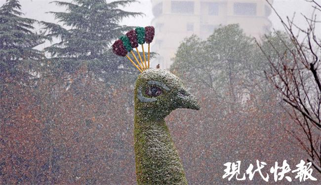 鼓楼广场,孔雀绿雕身披银衣 , 显得格外灵动。