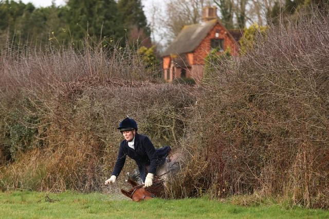 12月26日,在英国奇丁斯通,骑手参加传统的节礼日狩猎活动时摔倒在地。新华社/路透
