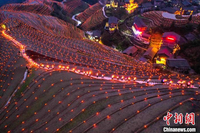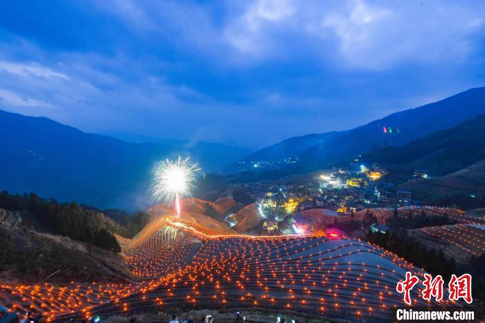2023年12月31日晚,在广西桂林市龙胜各族自治县龙脊镇平安村,上万支形如火把的LED灯把层层叠叠的龙脊梯田点亮,人们在梯田之间点亮烟花,与错落有致的吊脚楼、璀璨的夜空交相辉映,勾勒出一幅壮观的乡村夜景图,呈现出“万家灯火欢乐祥和”景象,吸引众多游客前来观赏打卡,以此特殊的方式跨年,喜迎元旦佳节。