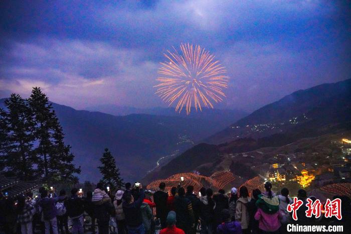 12月31日晚,在广西桂林市龙胜各族自治县龙脊镇平安村,游客在观赏梯田焰火美景。潘志祥摄