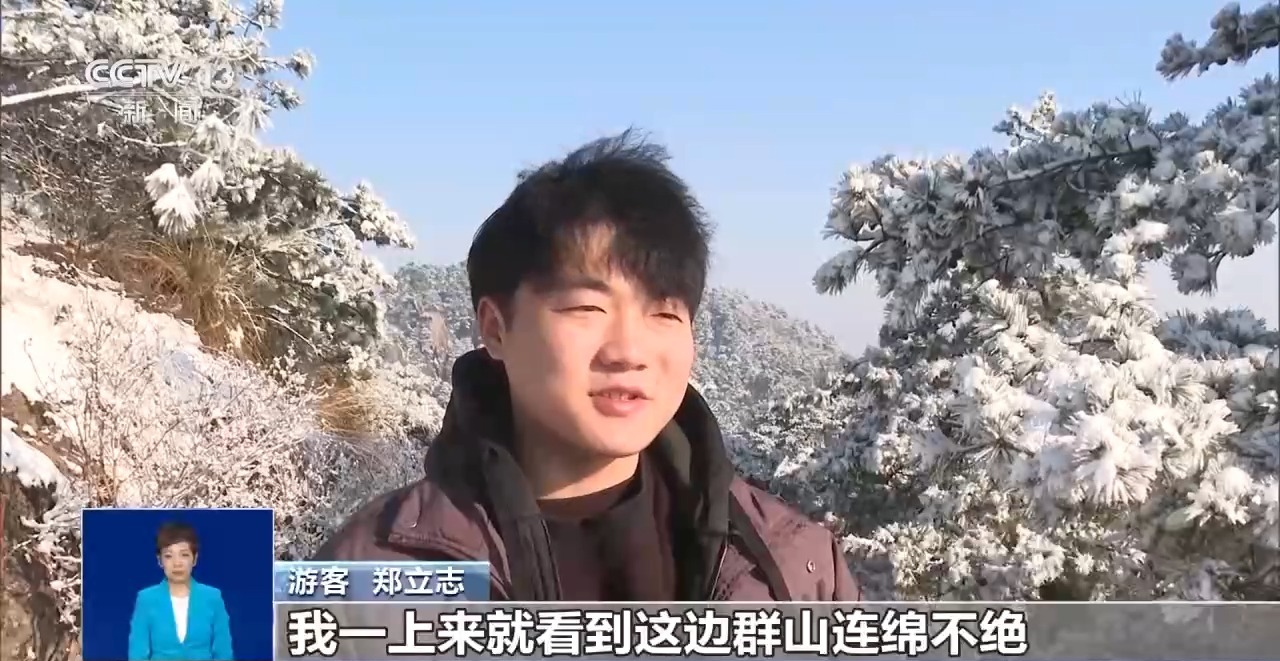 游客 郑立志:我一上来就看到这边群山连绵不绝,太阳映照在松树上面,树上面挂着雪凇,非常好看。