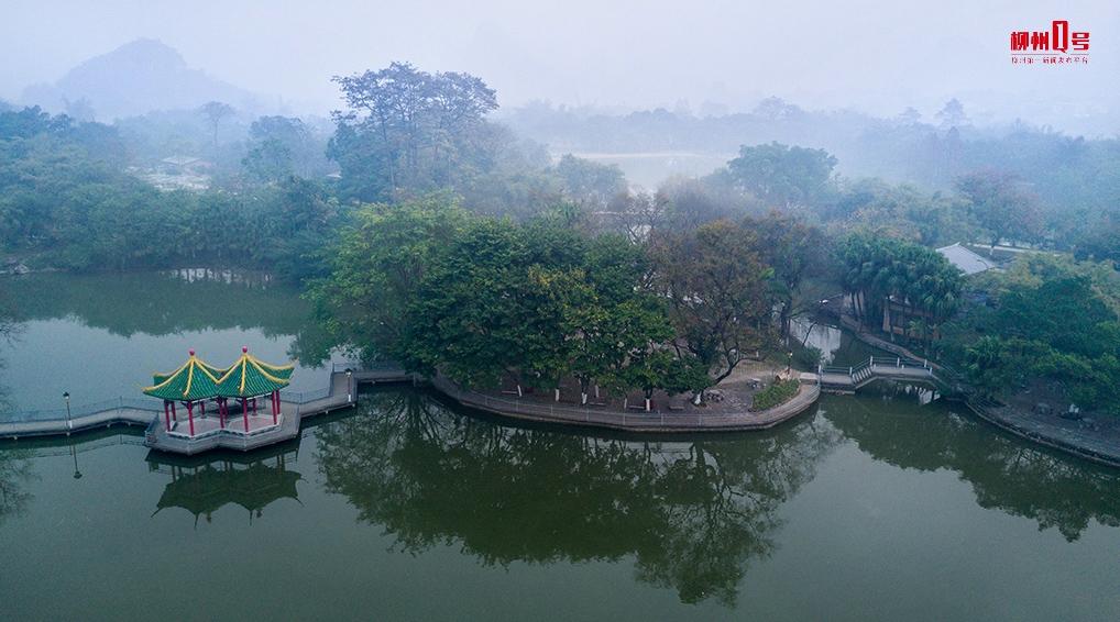 晨雾缭绕的柳州都乐公园像一首诗。近日,都乐公园的天空被一层薄薄的晨雾所覆盖,与树木、光束构成了一幅自然和谐的美景。
