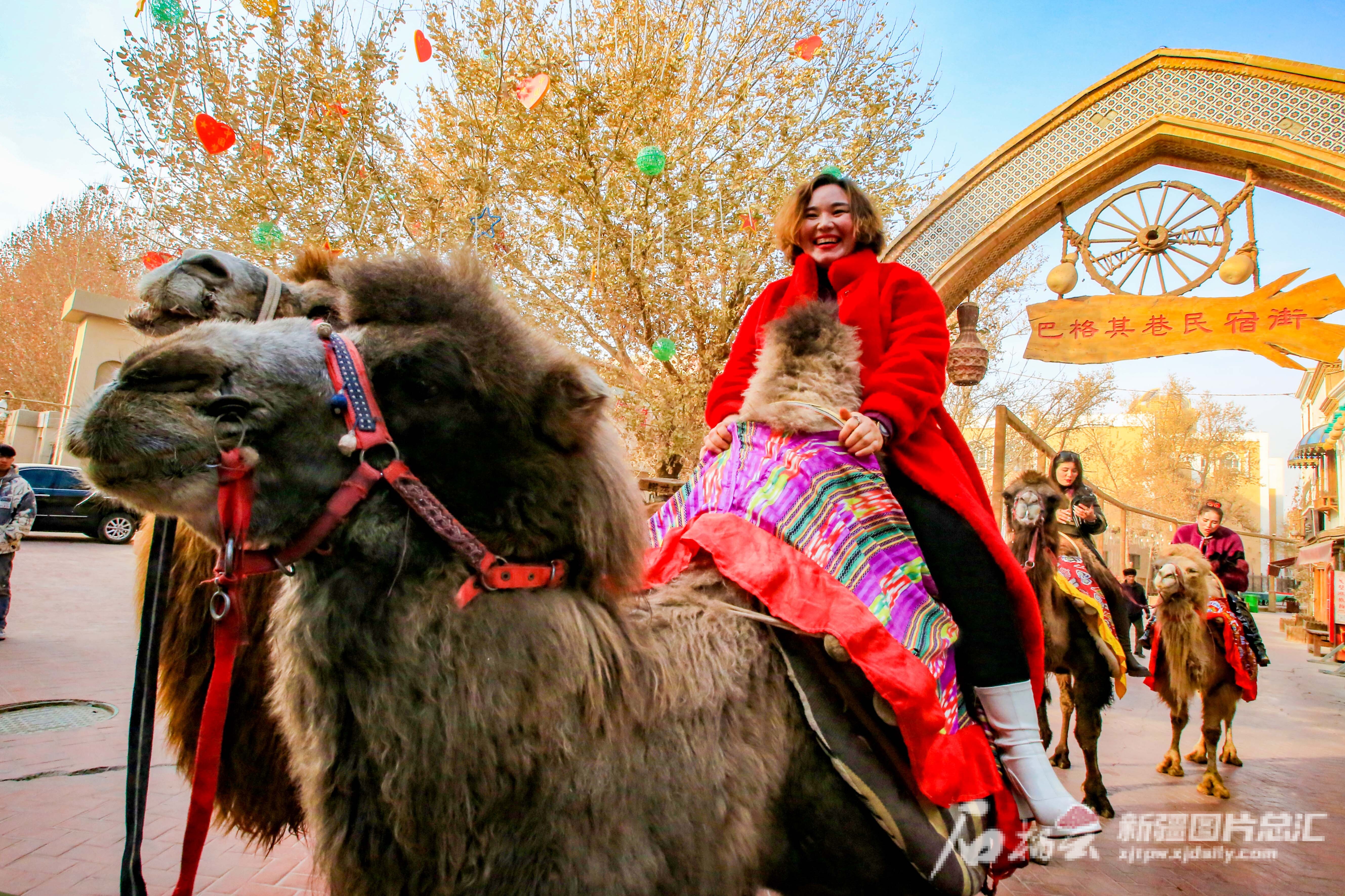 2024年1月2日,游客在喀什古城景区骑骆驼游玩。