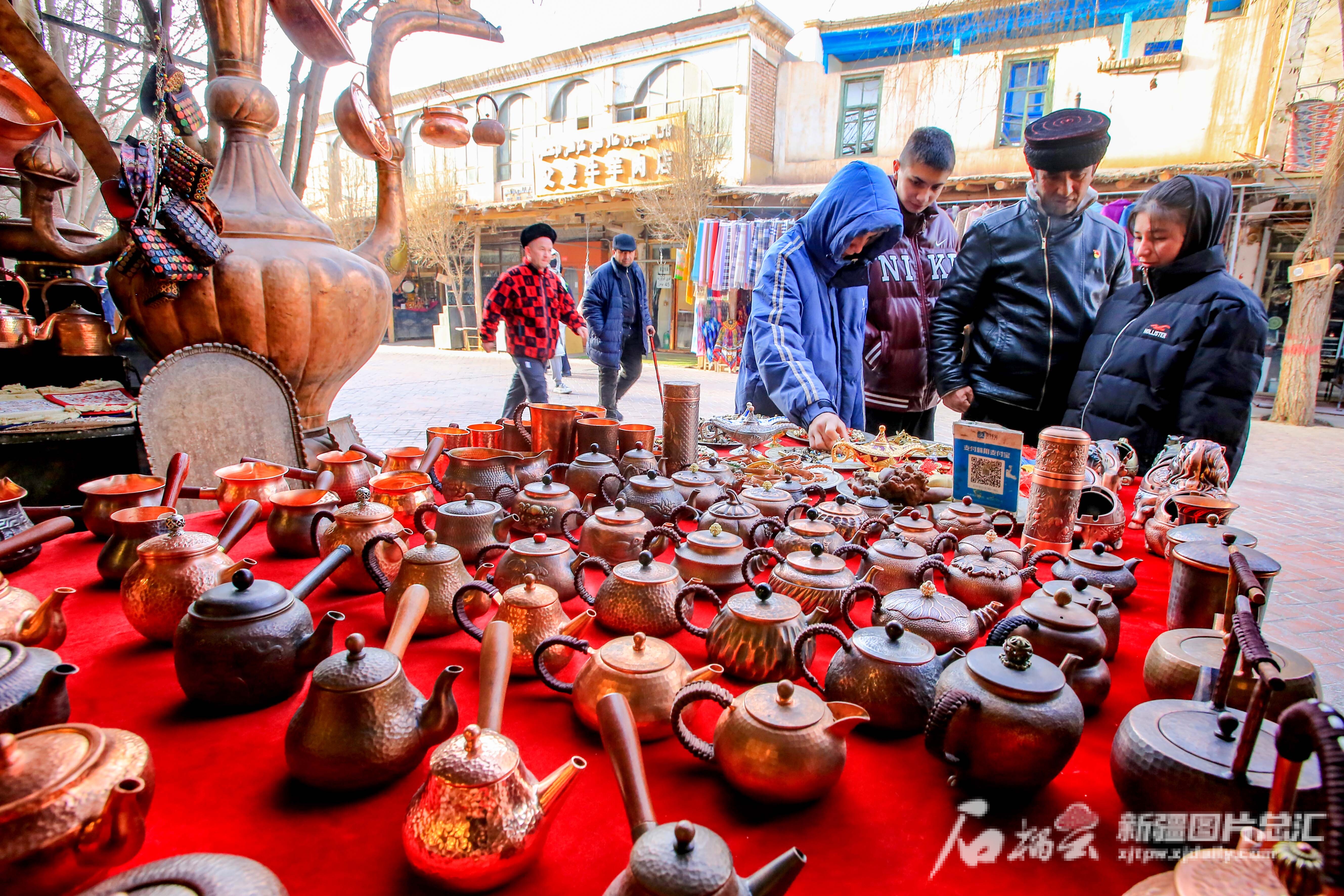 2023年12月31日,游客在喀什古城景区挑选旅游纪念品。